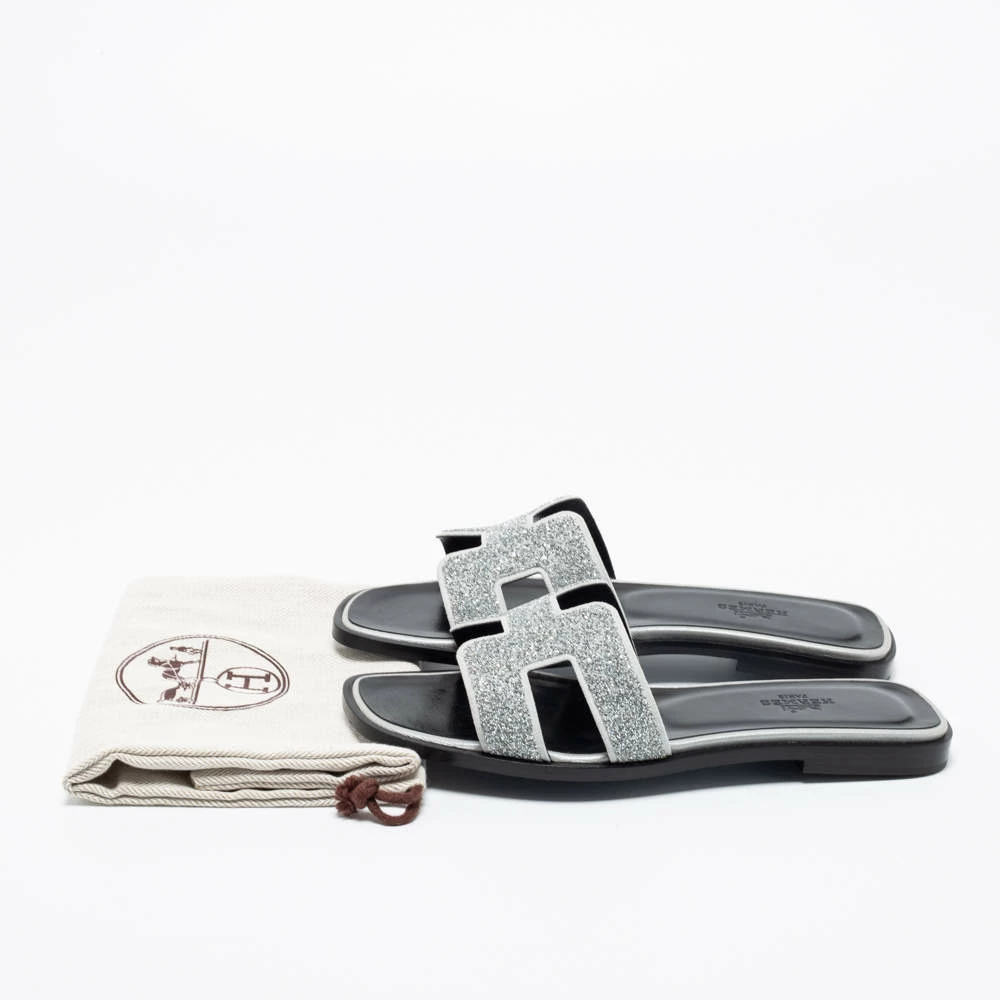 Add the iconic Hermès Oran sandals to your shoe collection with this pair. These silver and grey-hued flats have been crafted in Italy and they feature the iconic H on the studded vamps and lined insoles in leather to provide comfort at every step.