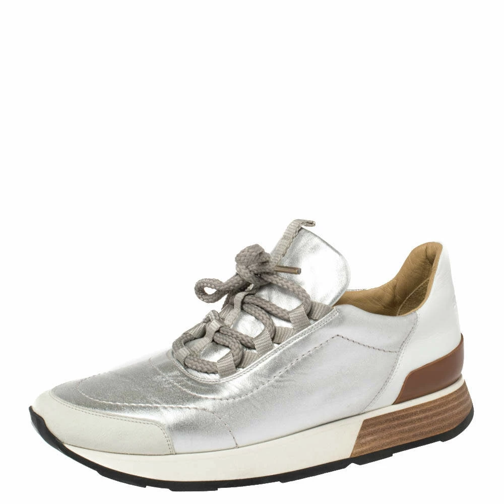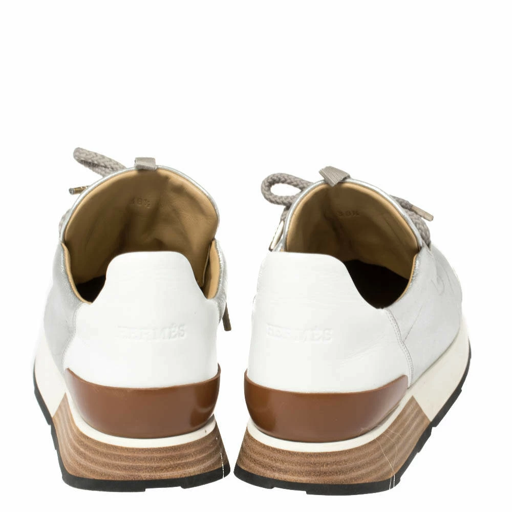 Let this pair of low-top Hermès sneakers elevate your style this season. Crafted from silver leather and suede, these sneakers feature round toes and lace-ups on the vamps. They have been detailed with the brand label on the counters and made comfortable with leather-lined insoles and tough rubber soles. Pair them with smart t-shirts and denims.