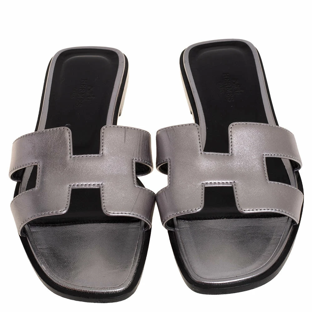 Put your best foot forward this season in these pretty Hermes sandals. These silver Oran sandals have been crafted from leather in Italy and they feature the iconic H on the vamps as well as insoles meant to provide comfort at every step. These sandals are sure to attract admirers!