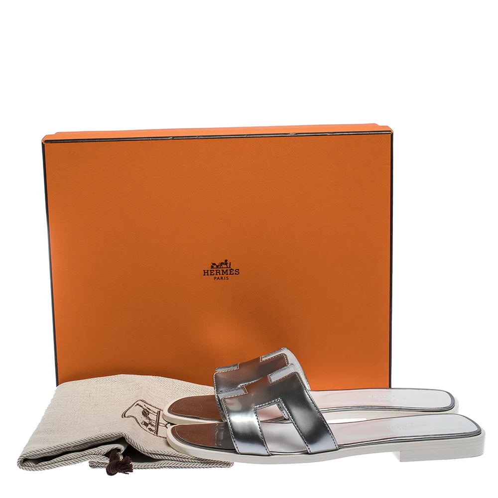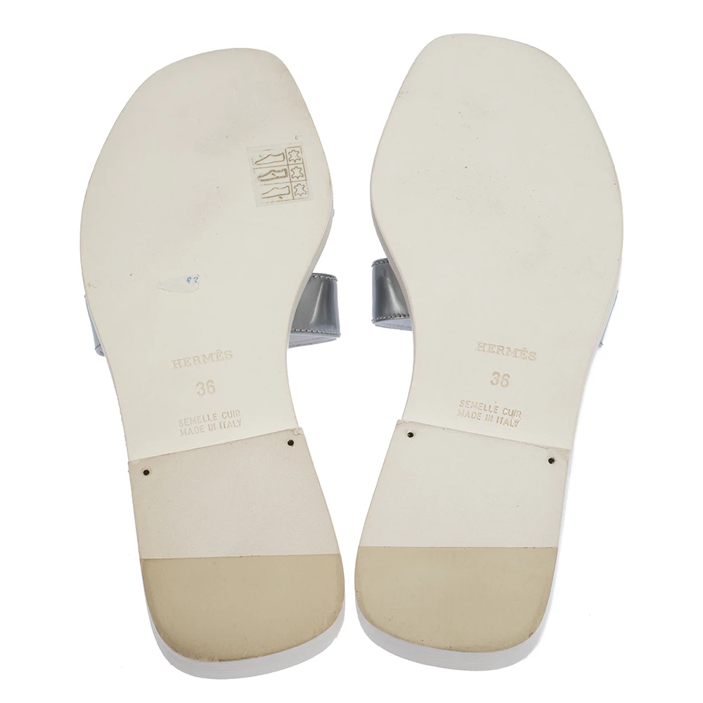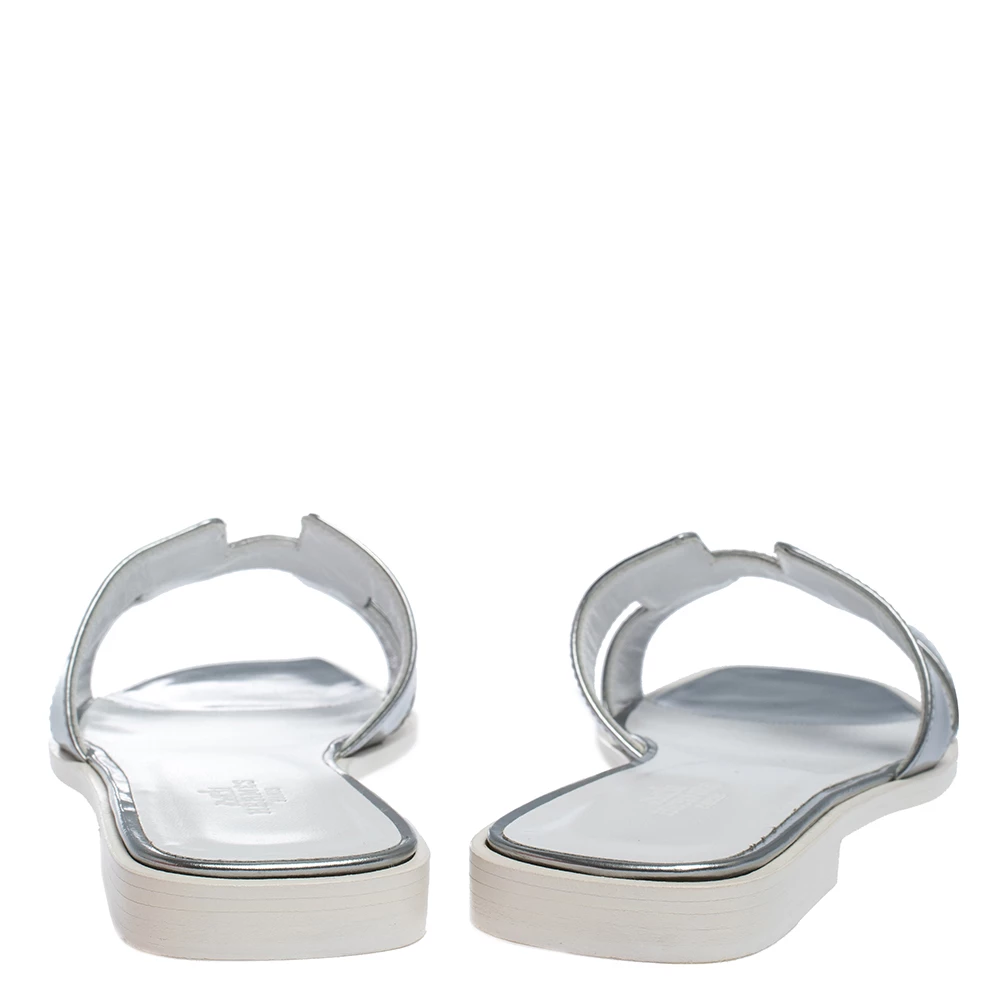 Put your best foot forward this season in these pretty Hermes sandals. These silver Oran sandals have been crafted from patent leather in Italy and they feature the iconic H on the vamps as well as insoles meant to provide comfort at every step. These sandals are sure to attract admirers!