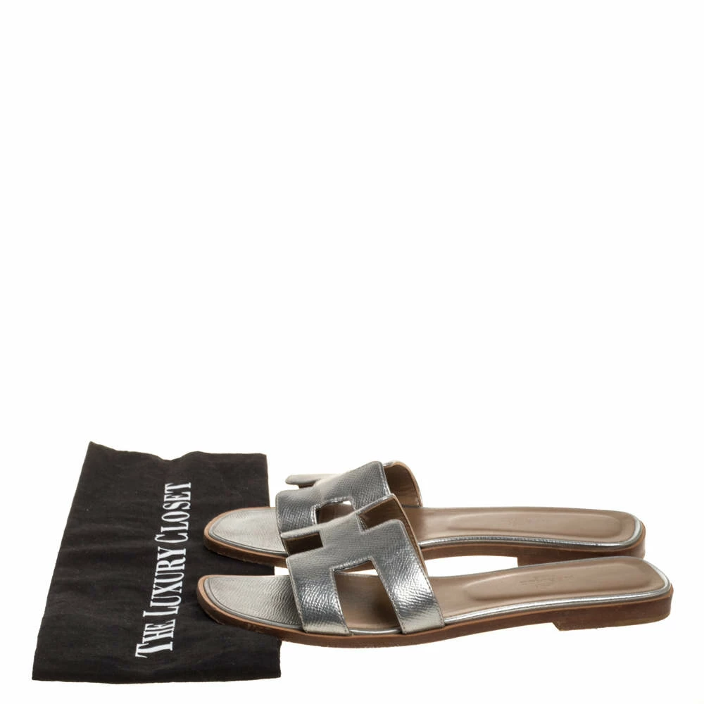Put your best foot forward this season in these pretty Hermes flats. These silver Oran flats have been crafted from textured leather in Italy and they feature the iconic ‘H’ on the vamps as well as insoles meant to provide comfort at every step. These flats are sure to attract admirers!