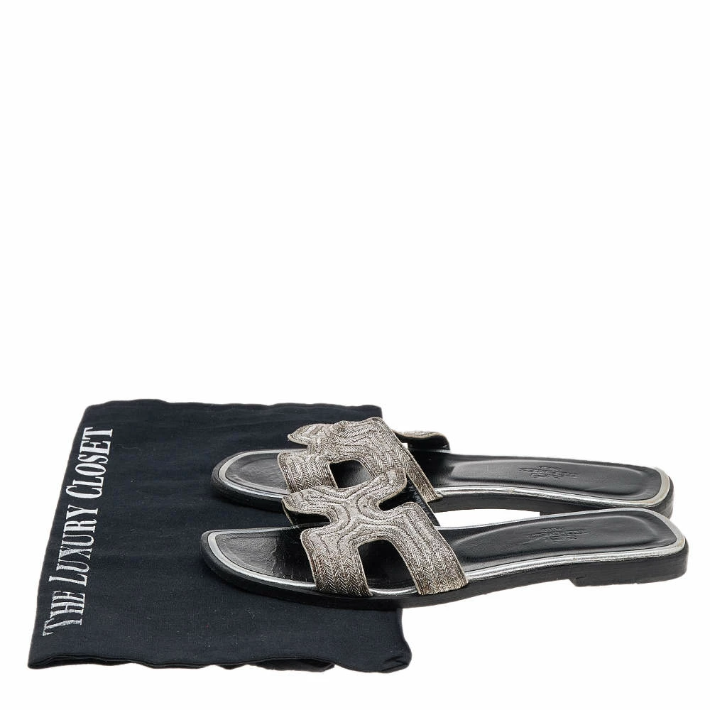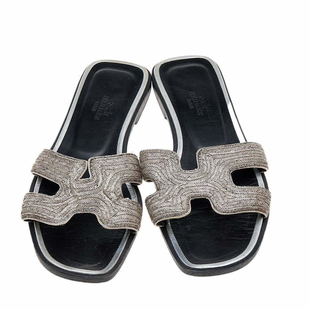 The House of Hermes provides its audience with exclusive designs that are unfailingly modern and poised. These Oran sandals lend your feet a unique style and appearance like none other. They flaunt a cut-out H strap across the upper, which is crafted from silver twisted-metal thread. Find true comfort as you walk in these sandals.