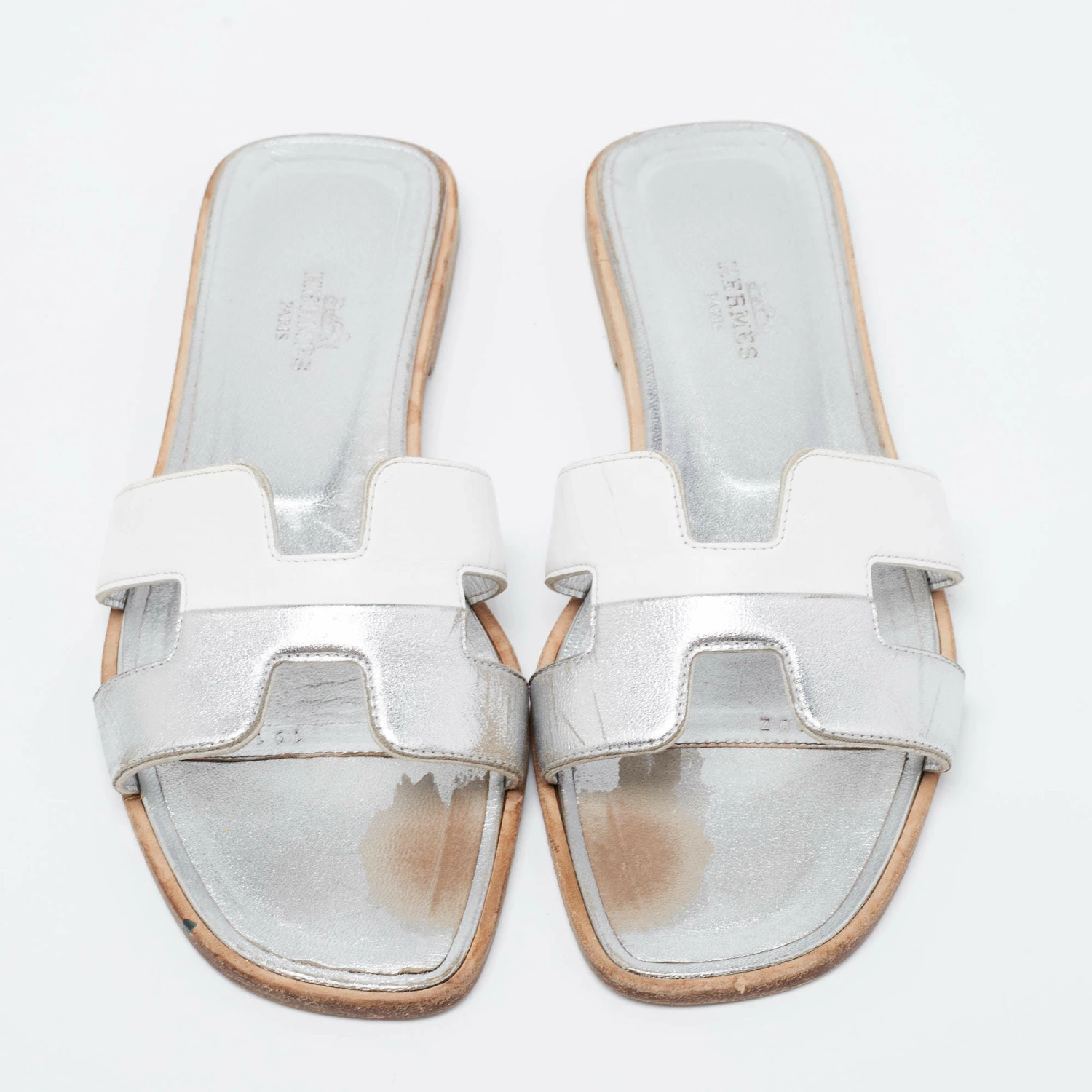 Add the iconic Hermès Oran sandals to your shoe collection with this pair. These silver and white-hued flats have been crafted in Italy and they feature the iconic H on the vamps and lined insoles in leather to provide comfort at every step.
