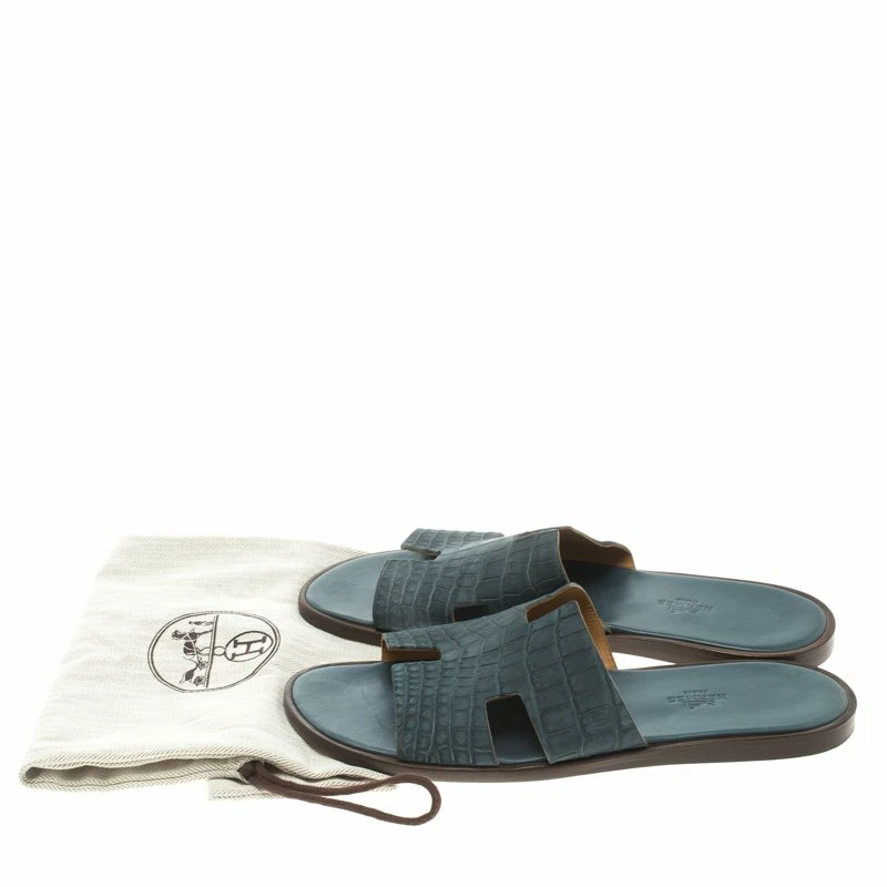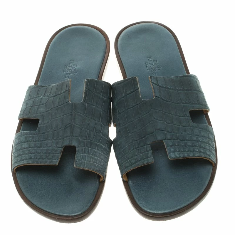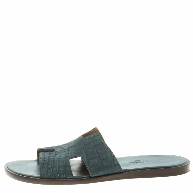 Hermes is a brand that epitomizes art and noticeably, all their designs have a luxurious blend of comfort and style. These slate grey Izmir sandals have been crafted from fine croc leather in Italy and they feature the iconic H on the vamp, making it easy to slip them on over all your casual outfits.