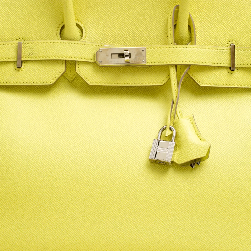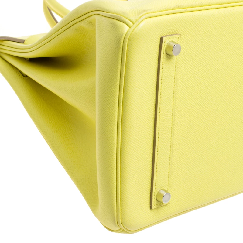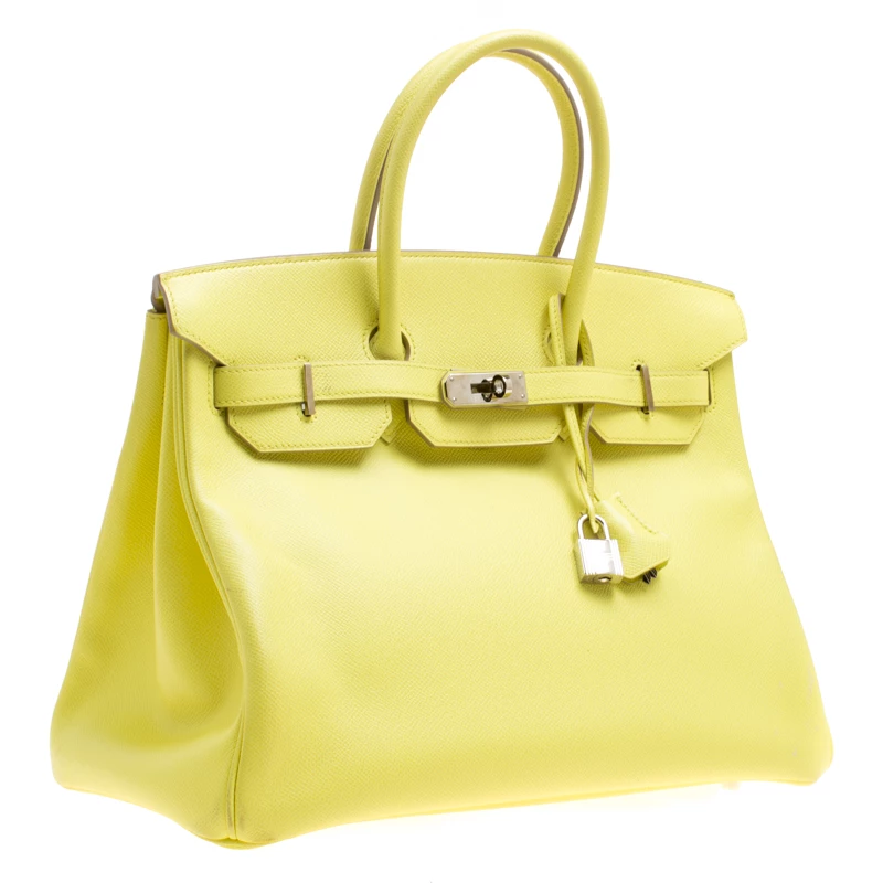 Hermes Birkin was inspired by Jane Birkin and is one of the most desired handbags in the world. A timeless classic that never goes out of style. Handcrafted from the highest quality of leather by skilled artisans, it takes over 18 hours of rigorous effort to stitch a Birkin together. Crafted in France from Soufre Epsom leather, the bag features dual top rolled handles and a padlock with its keys within the clochette. The bag comes with palladium hardware and has a spacious leather lined interior that houses a zip pocket. Birkin 35 can hold all your daily necessities and more. Invest in this beauty as it retains its value year after year.