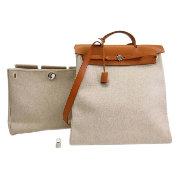 Carry this chic and functional Herbag convertible satchel by Hermes along with you everywhere. The stylish design has a smooth structured tan leather top with a beige canvas body that can be switched up between a small and a large bag that convert this tote into a backpack. The look is completed with flap front closure, Hermes’s signature clochette, keys, top handle, and shoulder strap. Its roomy open interior is unlined and will comfortably hold all of your daily necessities!Gender: WomenCondition: Gently Used (This bag has slight scratches, unnoticeable stains, slight wrinkles, and partial scuffs. The hardware has small scratches and the interior has slight scratches and unnoticeable stains)Dimensions: Tall Bag: 33 CM(L) 37 CM(H) 13 CM(W) | Wide Bag: 35 CM(L) 29 CM(H) 12 CM(W)Handle Drop: 12 CMShoulder Strap: 96.5 CMExterior Material: Leather, CanvasInterior Material: CanvasHardware: Silver-toneIncludes: The Luxury Closet Packaging
