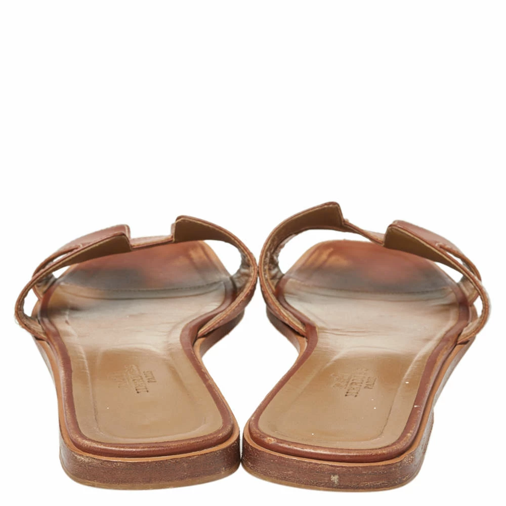 Put your best foot forward this season in these pretty Hermes sandals. These tan Oran sandals have been crafted from leather in Italy and they feature the iconic H on the vamps as well as insoles meant to provide comfort at every step. These sandals are sure to attract admirers!