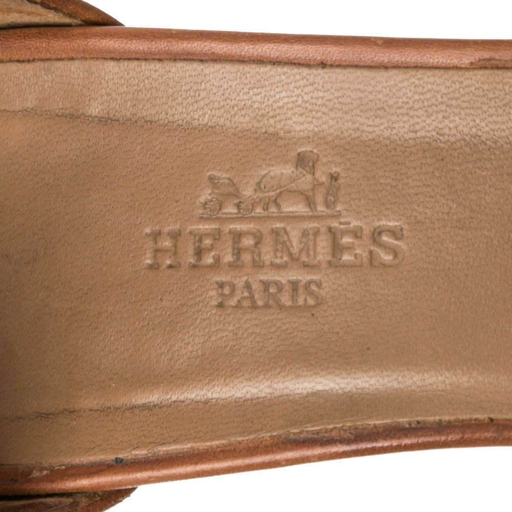 These Premiere sandals made by Hermes, with their minimalistic style and faultless shape, provide your feet with the best experience. They feature tan-colored leather on the exterior, which is highlighted by gold-toned implements, an ankle strap, heels, and a neatly shaped counter. Pair these sandals with your everyday outfit to create an overachieving style.