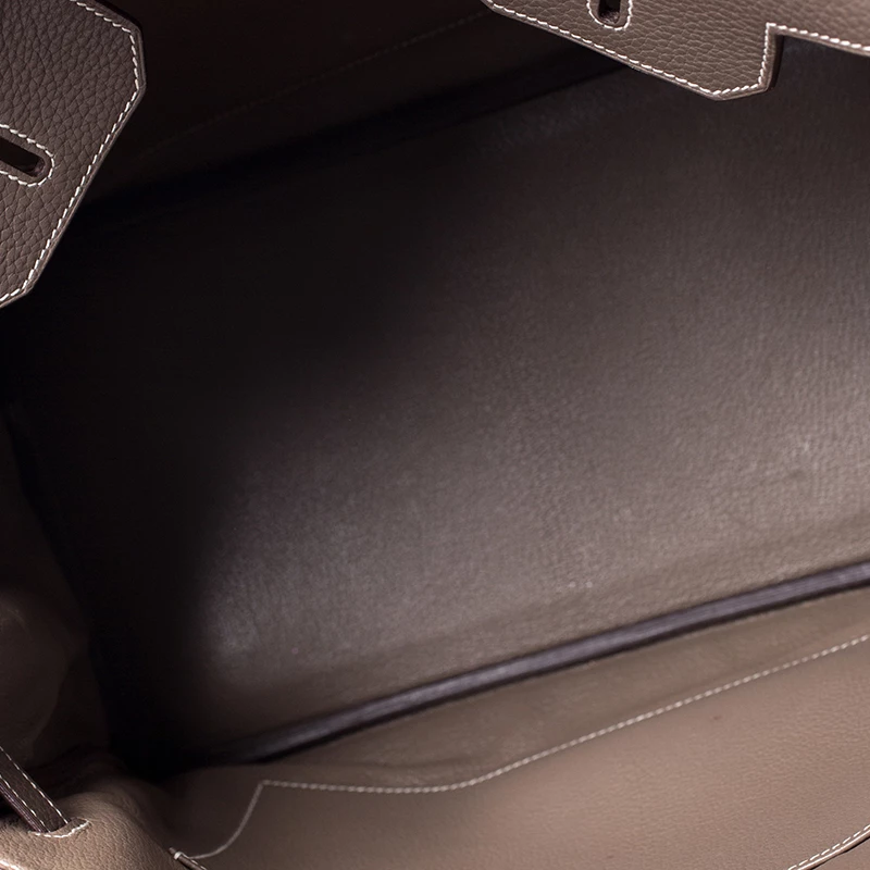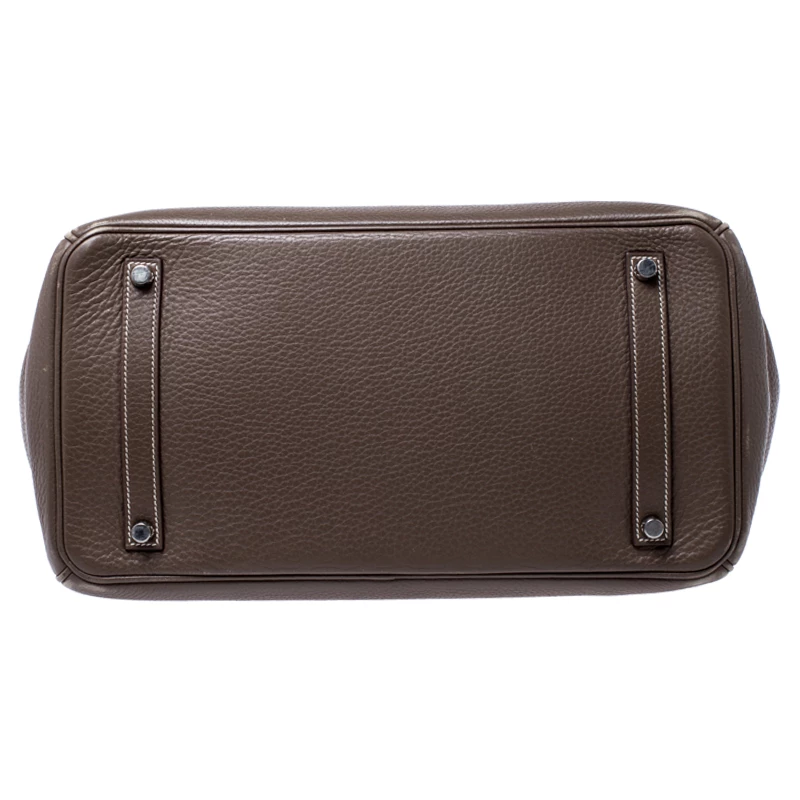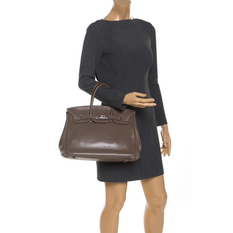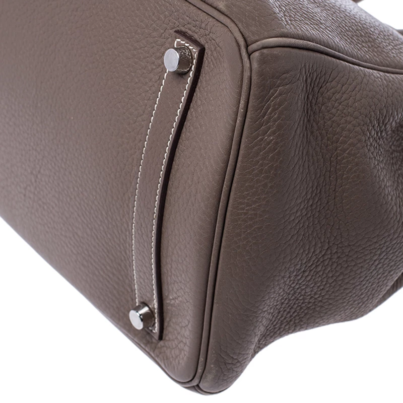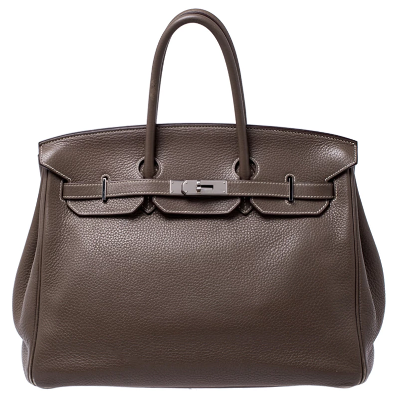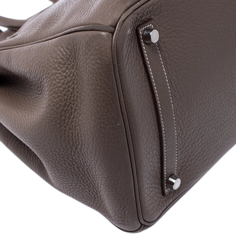 A bag that has become a hallmark of luxury and class, the Birkin from Hermes is one of the most coveted bags in the world. Custom-made on the suggestions of Jane Birkin, hence the namesake, this bag is aimed to fit the wants of the fast-paced life of modern women. Timeless design coupled with rich craftsmanship, the structured body of this Birkin 35 bag is crafted from Clemence leather in a grey hue. Its foldover top is secured by silver-tone turn-lock closure, accompanied by a dangling lock and key which is safe within a leather clochette. The interior of the bag has leather lining and is equipped with a zip pocket for storing little essentials. Complete with dual rolled handles and studs at the bottom, this bag is an investment that will last you for years.