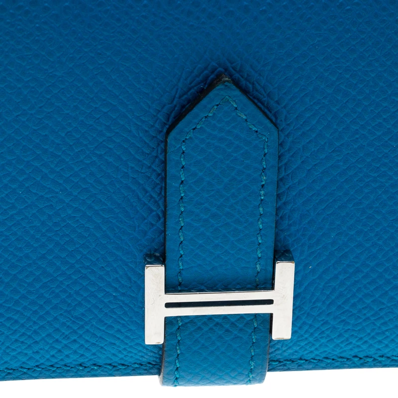 Hermes yet again charms us with this stunner of a creation that looks quite chic and stylish! This teal blue Bearn card holder is crafted from the signature Epsom leather and features a front tuck-in strap closure with a silver-tone ‘H’ buckle and opens to a leather-lined interior that houses multiple card slots. Carry it in hand or stack it inside a bag for this fabulous piece is all about convenience and is high on style as well.