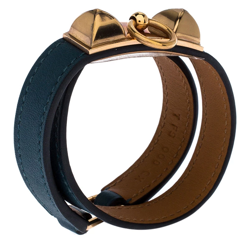 Designed in leather, this Rivale bracelet is a loved design from the house of Hermes. This bracelet is accented with gold-plated studs and ring for the signature Hermes look. It is a versatile creation that you can wear with casuals.