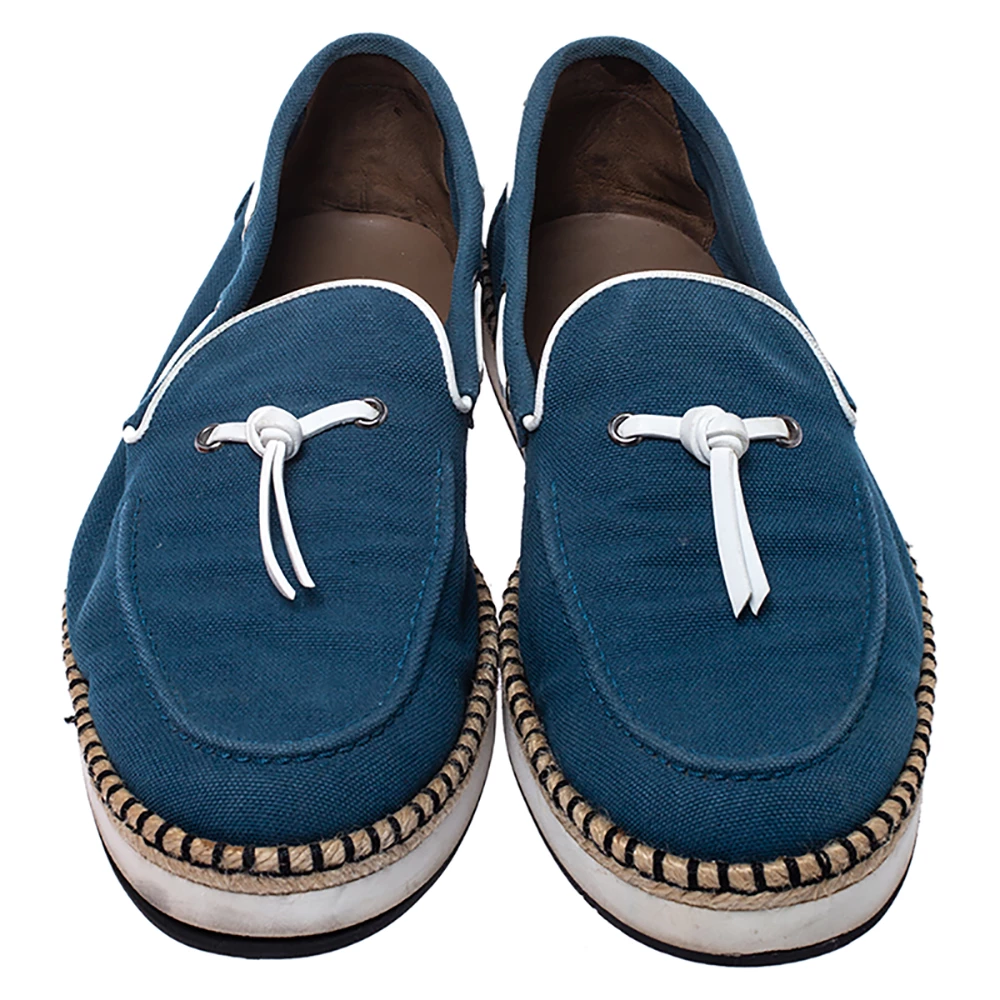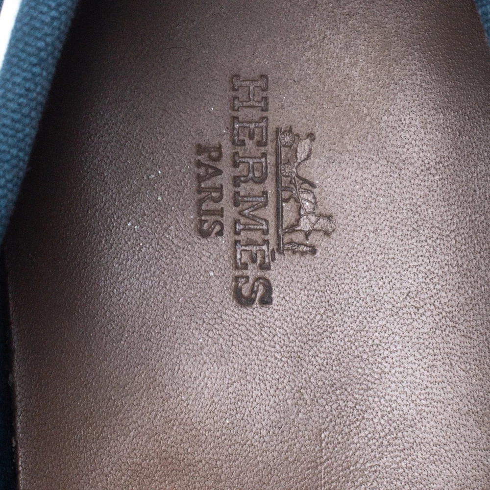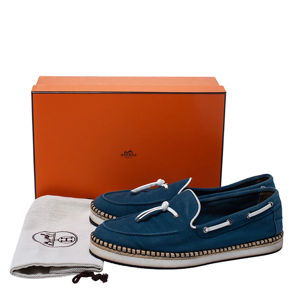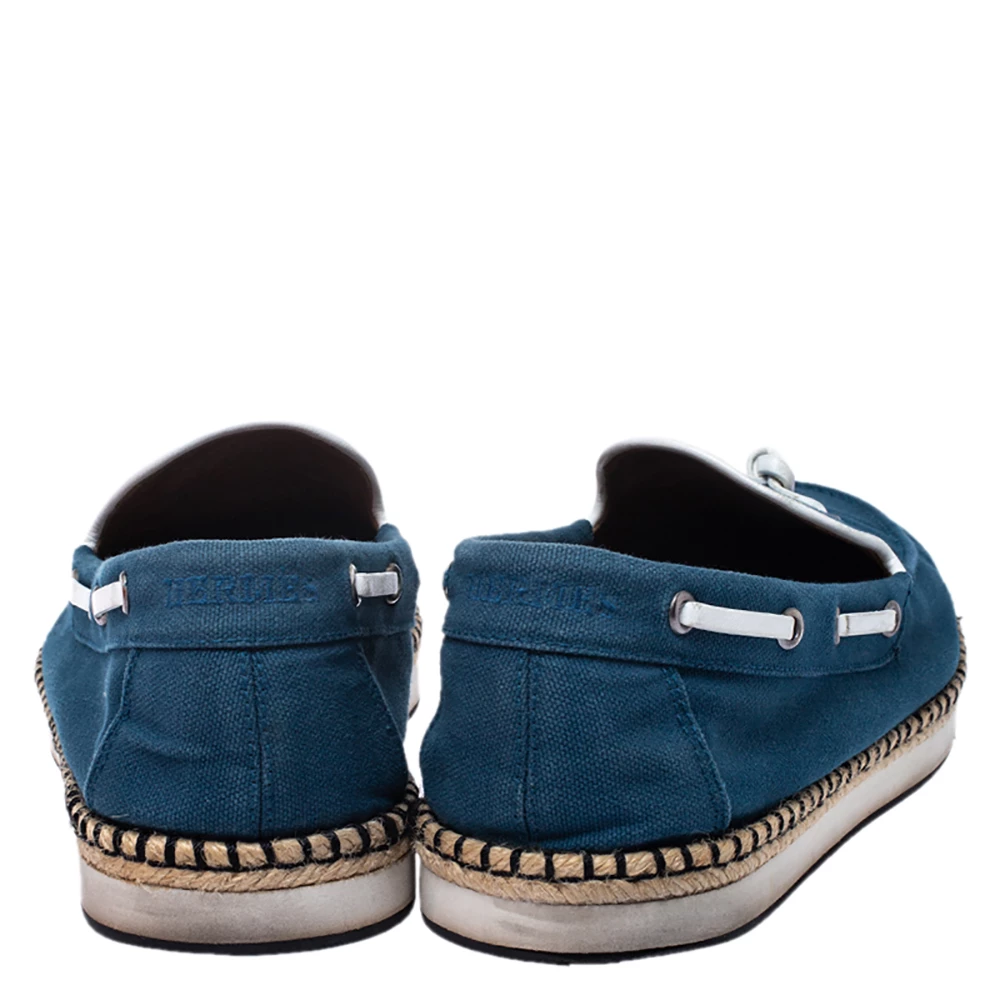 Casual fashion gets easier with these Optimiste moccasins from Hermes! Crafted from teal-colored canvas and trimmed with white leather, these shoes come with tie detail on the vamps and braided details on the midsoles. They are lined with leather on the insoles to provide you with comfort and are complete with robust outsoles.