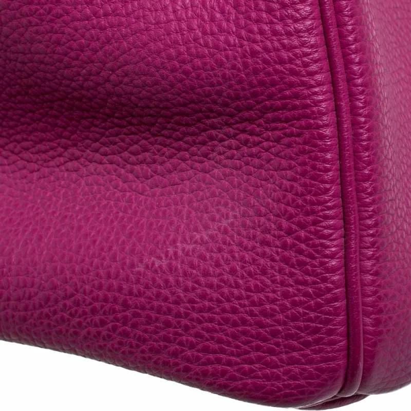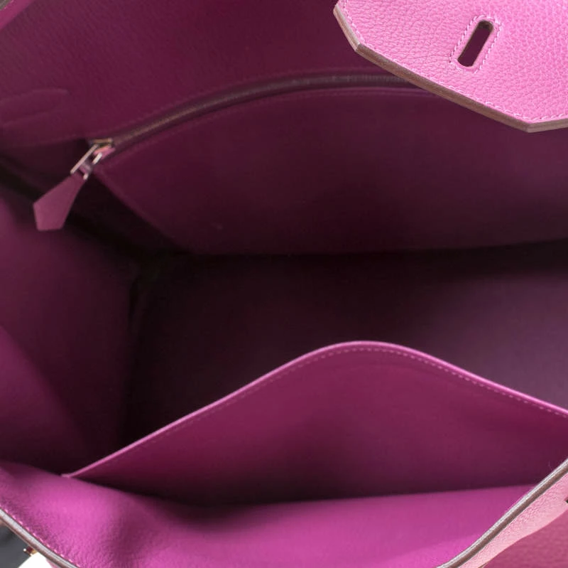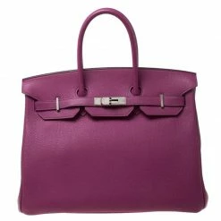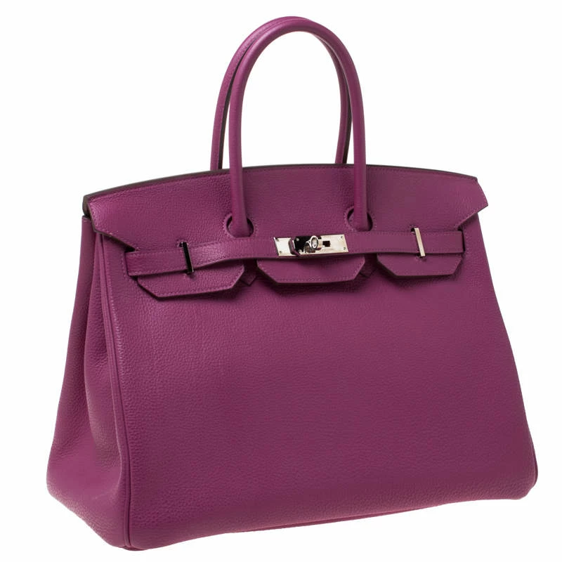 A bag that has become a hallmark of luxury and class, the Birkin from Hermes is one of the most coveted bags in the world. Custom-made on the suggestions of Jane Birkin, hence the namesake, this bag is aimed to fit the wants of the fast-paced life of modern women. Timeless design coupled with rich craftsmanship, the structured body of this Birkin 35 bag is crafted from Togo leather. Its foldover top is secured by a palladium turn-lock closure which is accompanied by a dangling key safe within a leather clochette. The interior of the bag has leather lining and is equipped with a zip pocket for storing little essentials. Complete with dual-rolled handles and studs at the bottom, this bag is an investment that will last you for years.