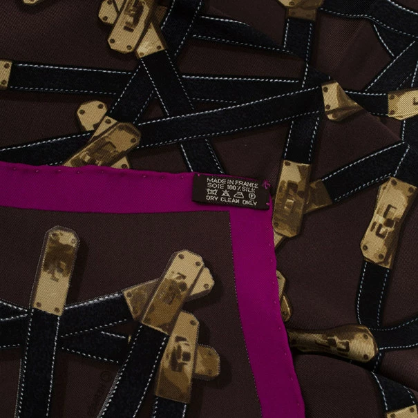 Rare and beautiful, this Hermes silk square scarf has the kelly logo in black all over on brown background with a fuschia border.Original Retail Price: US $450