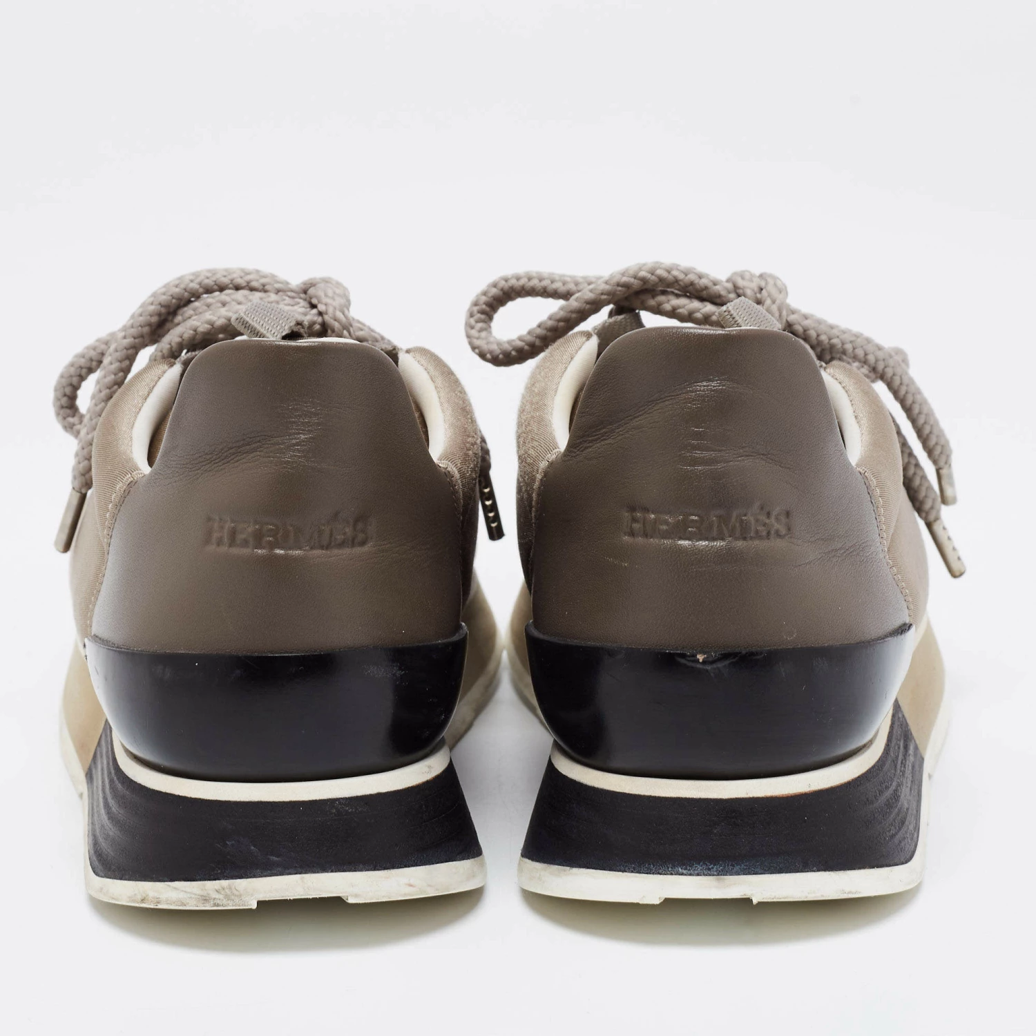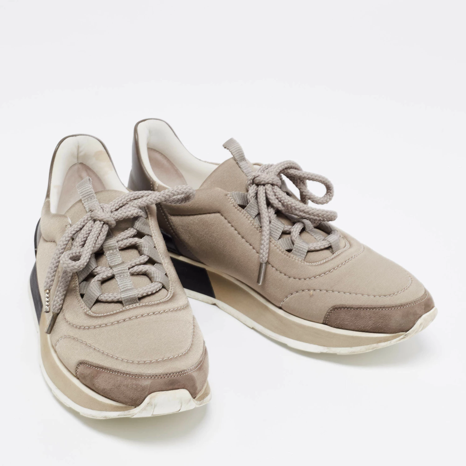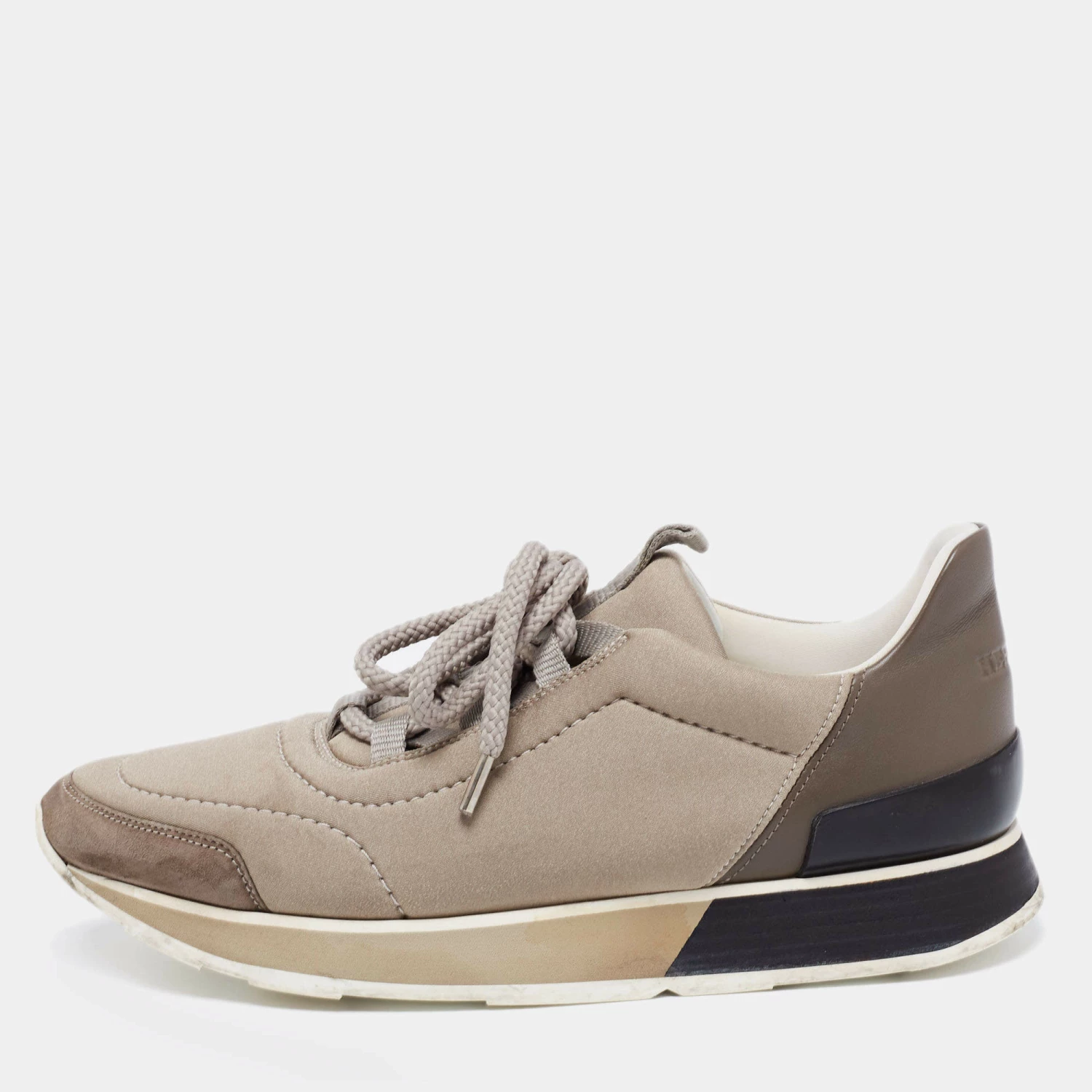 Complete your casual look by sporting these Miles sneakers from the House of Hermes. They are fashioned in tricolored suede, fabric, and leather on the exterior. They showcase a low-top profile with lace-up fastenings on their vamps. These Hermes sneakers are worth the splurge!