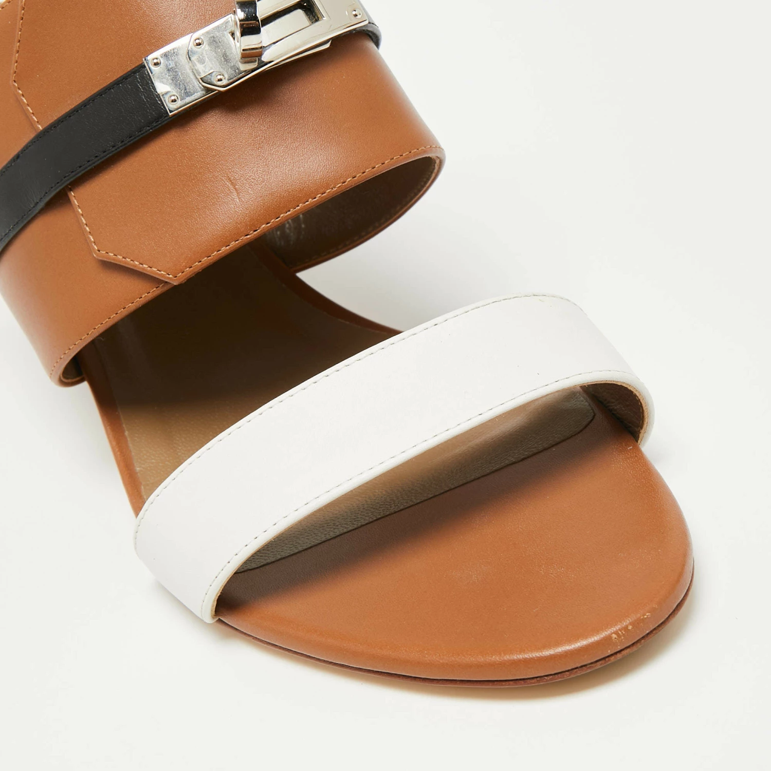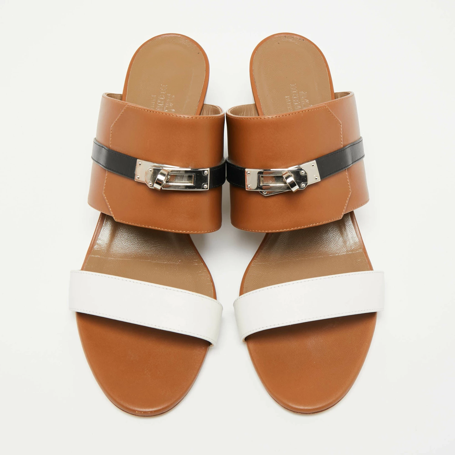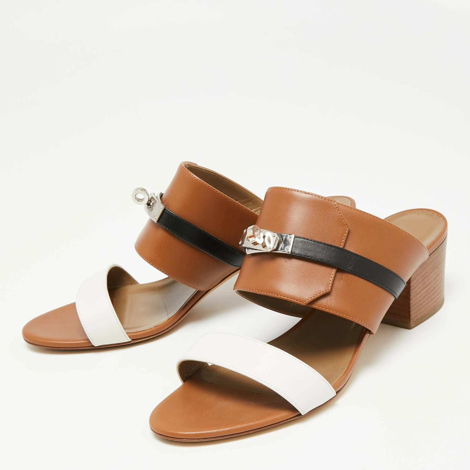 These leather slides from Hermès are a pair of simple and casual shoes. These slides have a slender strap at the toes and a broader one at the vamps accented with the signature Kelly lock in silver-tone. It is finished with open toes and block heels.