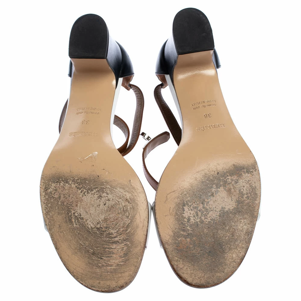 Beauty flows out of these sandals from Hermes! Crafted from tricolor leather, these sandals have a single front strap, closed counters with ankle turn-lock straps, and short block heels. They will accompany both your casual and party outfits well.