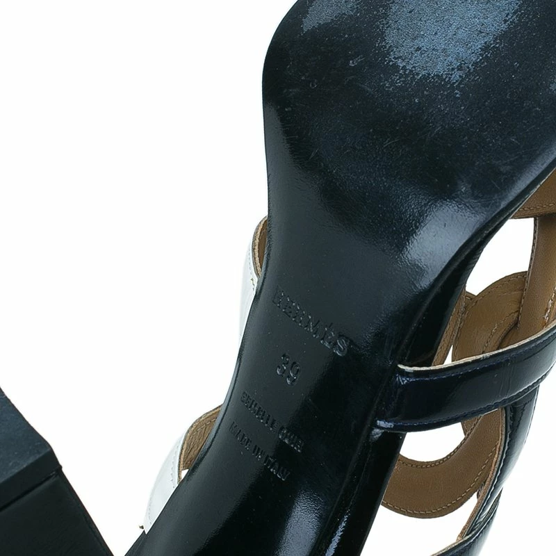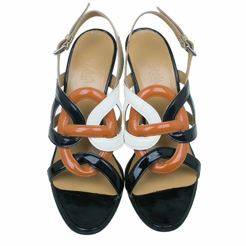 Crafted with leather in three colors, this pair comes from the fashion house of Hermes. Displaying intertwining strappy pattern at the vamps they are equipped with pin buckled ankle straps. Accented with 10cm chunky heels, they feature leather lined insoles.