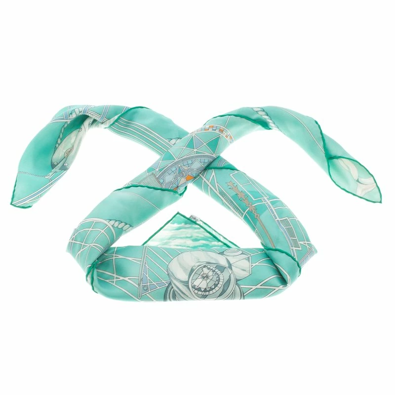 You are bound to impress watchers with this mint green scarf from Hermes. Cut from luxurious silk, the Tuiga scarf has a gorgeous print all over its square expanse, and every accent on the piece speaks royalty. The scarf is complete with the brand label on it.