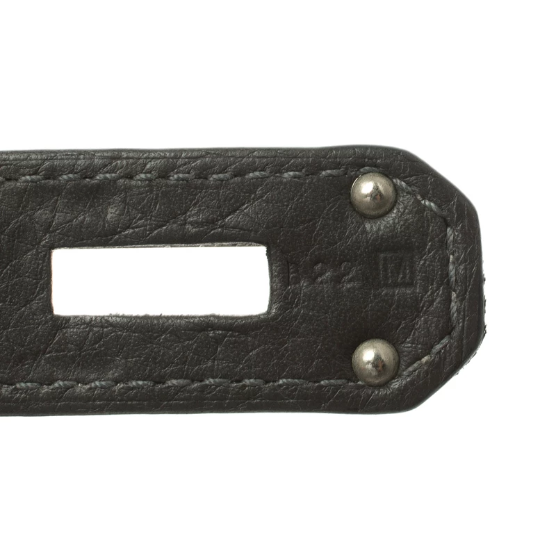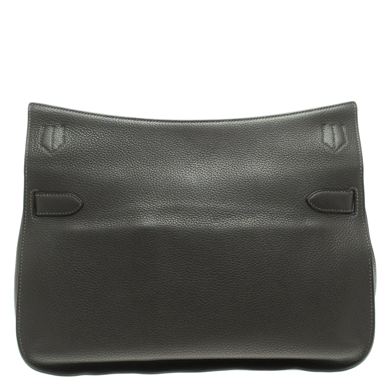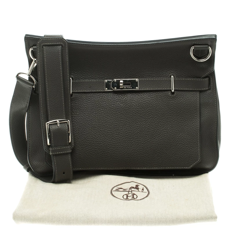 Hermes Jypsiere is a re-interpretation of the iconic Hermes Kelly. The messenger style bag is crafted from Vert Gris Taurillon Clemence leather. The bag has a round bottom and features a thick adjustable shoulder strap that provides the needed comfort. The front flap has a turn lock closure and opens to a leather lined interior that houses a slip pocket and a zip pocket. This versatile bag can be worn over the shoulder or crossbody.