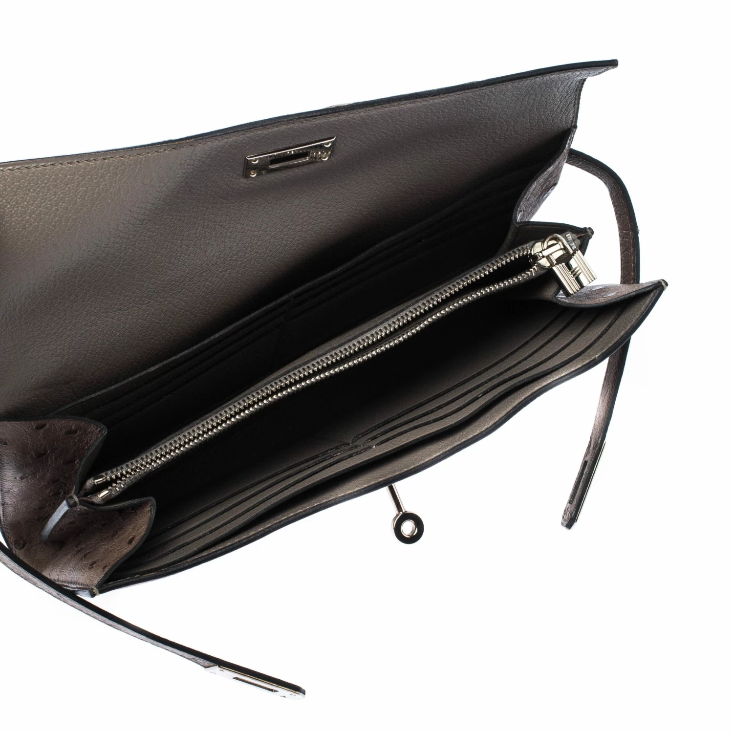 The Kelly is a name synonymous with Hermes. It is a symbol of their wondrous dedication to craftsmanship and classic style. The lock of the bag, which is a turn lock, now appears in jewellery and wallets. This long wallet is exquisitely crafted from ostrich leather and it carries the iconic Kelly lock in silver tone. The flap lifts to reveal multiple card slots, two bill pockets and a zip compartment. Brimming with lavish details and artistry, this wondrous creation deserves to be yours.