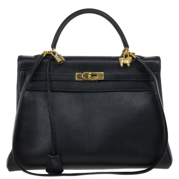 A must-have for any vintage collector, this Hermes Kelly is one that reminds us of Audrey Hepburn’s class and the 50s. Its attached black leather gloves are designed with brown leather outlines symbolizing the Hermes “H”. They are held with a gold-tone clasp and a matching lion charm, lock, and key holder. Its flap opening has the iconic snap lock closure, and opens up to a black leather-lined interior with two patch pockets and one zipped. Its versatile handles consist of a single rolled handle drop and a removable shoulder strap.