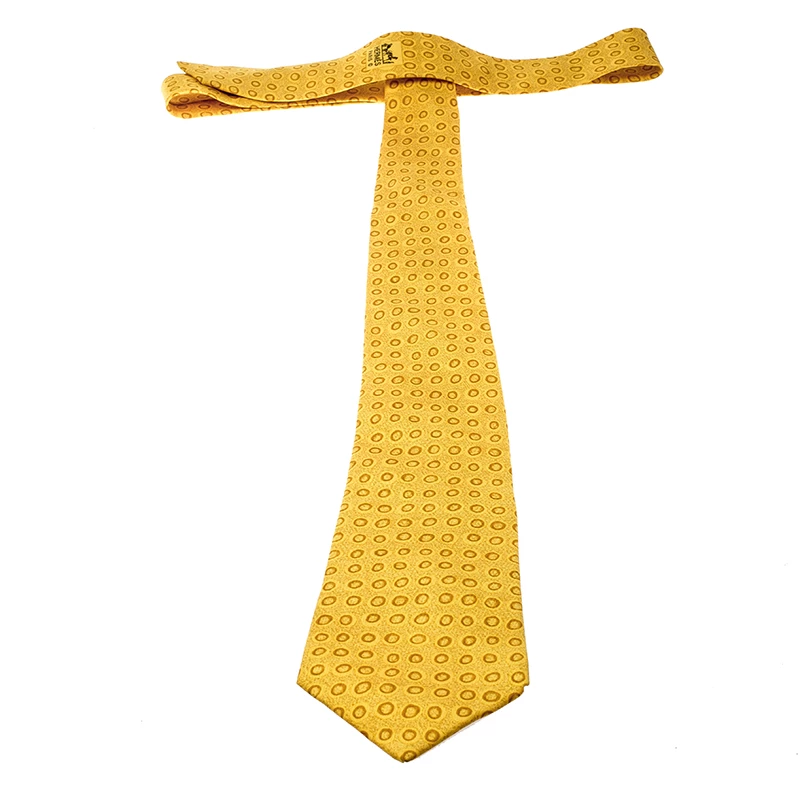 This silk crafted Hermes Vintage tie will instantly add a luxe touch to your evening suits. Featuring a mustard yellow colour with a circle print all over, the filling length and keeper loop at the rear complete this contemporary piece.