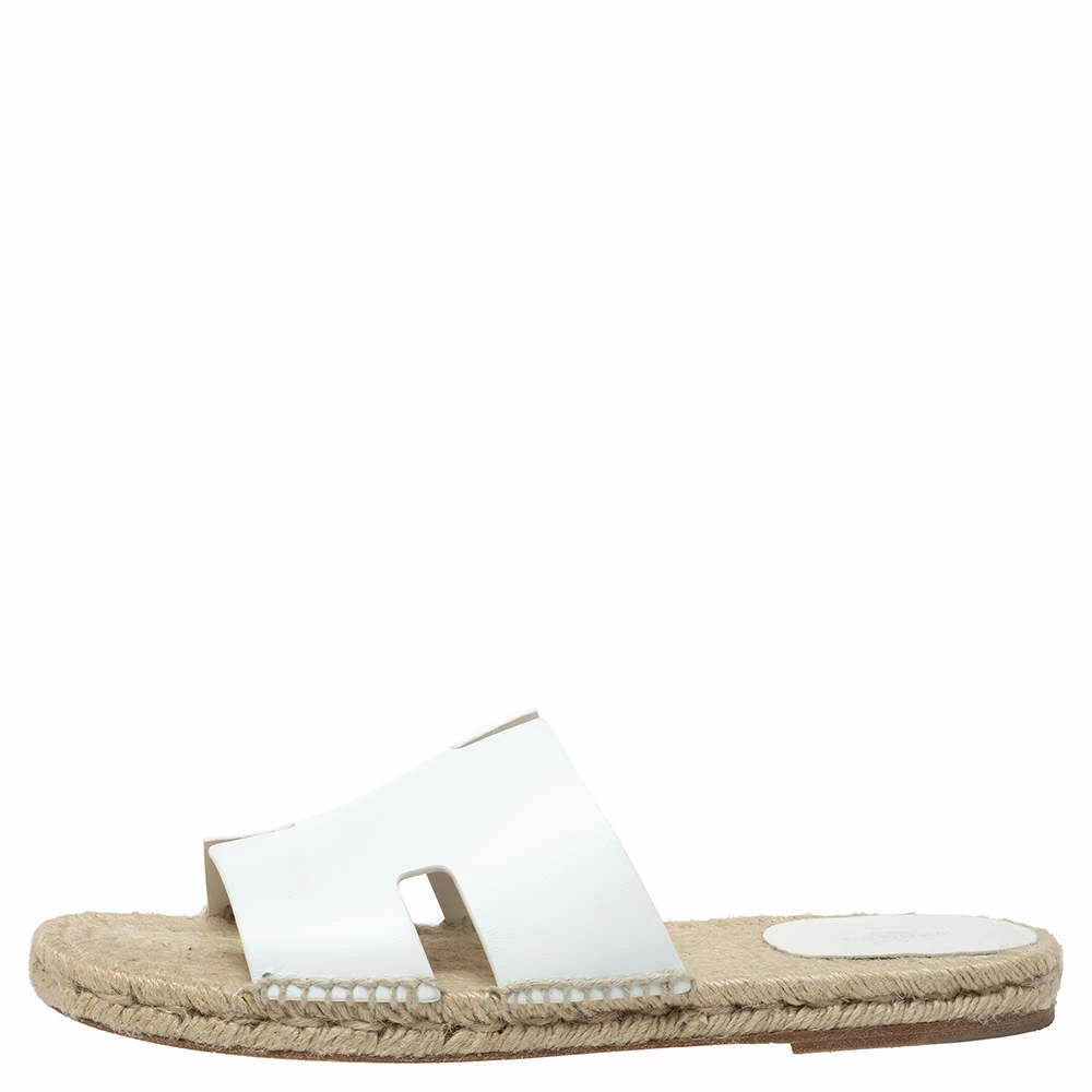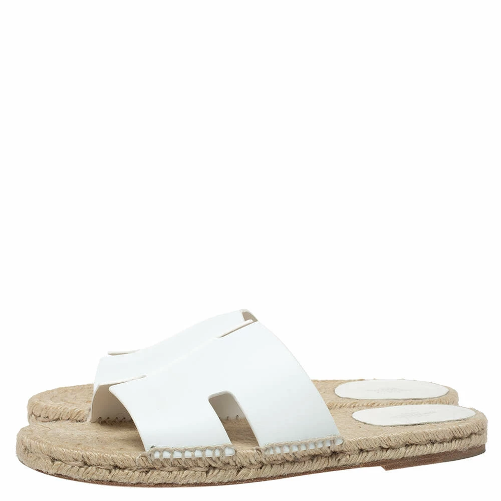 Stay comfortable on your next outing in these Hermes Antigua sandals. They are crafted from white leather and styled in an open-toe silhouette with the signature ‘H’ detailed vamps. They are complete with espadrille insoles.