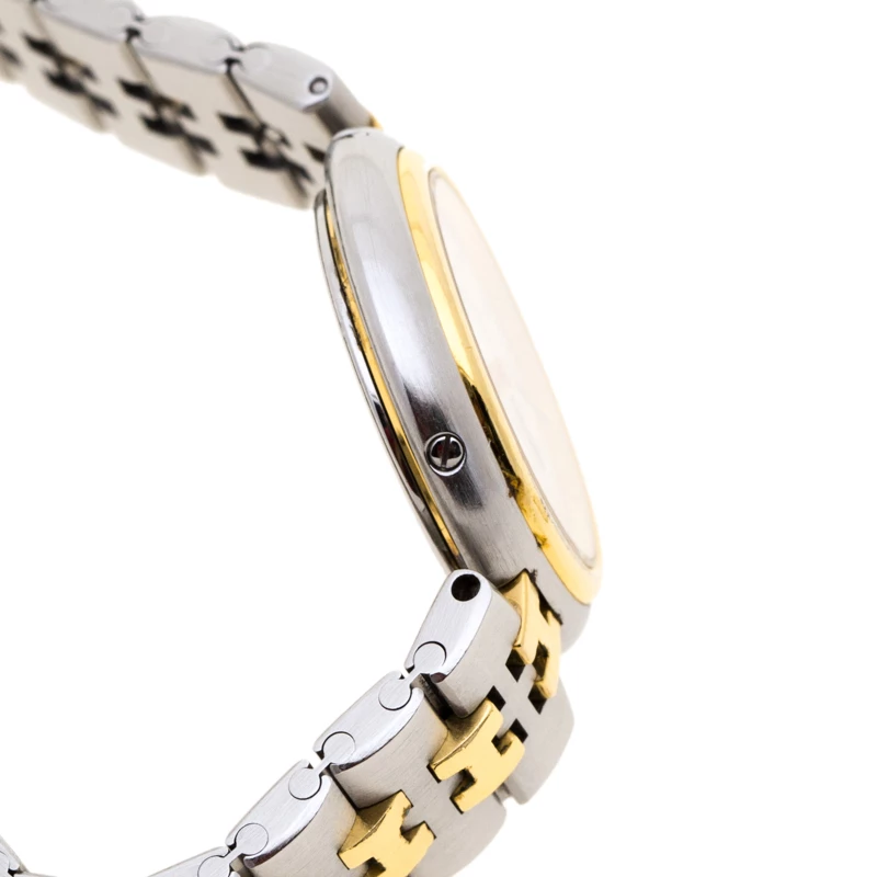 Designed with modern aesthetics, this Clipper wristwatch from Hermes is sophisticated and slick, ideal for women who prefer elegance and subtlety. Made from stainless steel, the bezel is styled with gold-plated metal. It features a round, white dial fitted with Arabic numeral hour markers, two stick hands, and a date window at three o’ clock position. The stainless steel is contrasted with the gold signature H links on the chain bracelet. This quartz watch has an engraved deployment clasp.