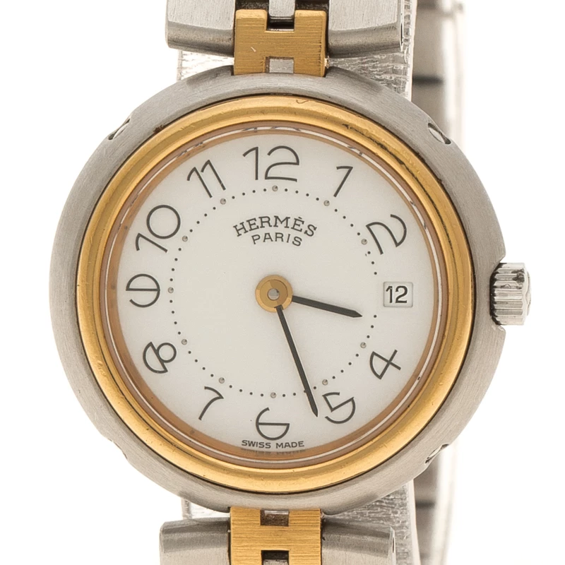 Perfect to assist you and enhance all your chic ensembles, this Hermes watch comes crafted from stainless steel and detailed with gold-tone. It features a white dial with Arabic numeral hours and a date window at the 3 o’clock position. The quartz watch is water resistant up to 30 meters and held by a label-engraved clasp.