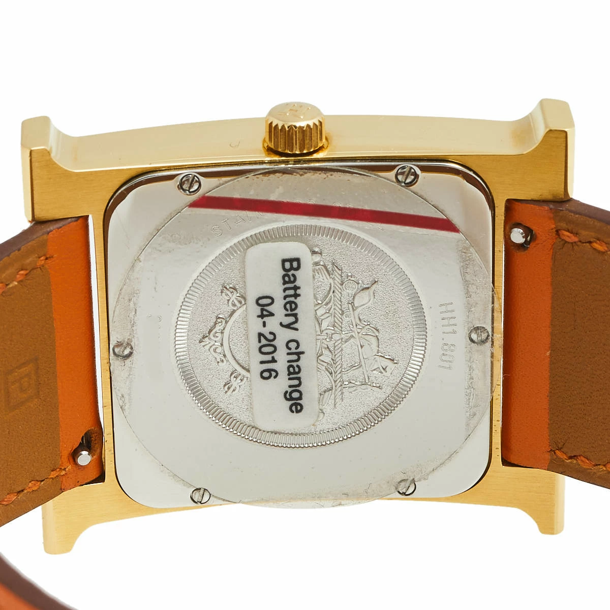 This Heure H watch from Hermes stands for quality and sophistication. The watch features a signature ‘H’ case in gold-plated stainless steel and held by leather straps with buckle fastenings. Powered by quartz movement, this elegant timepiece has a white dial equipped with Arabic numeral hour markers and stick hands. Complete with 30 meters of water resistance, this watch is a subtle way of giving yourself a polished look.
