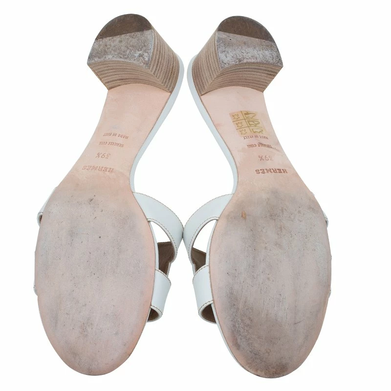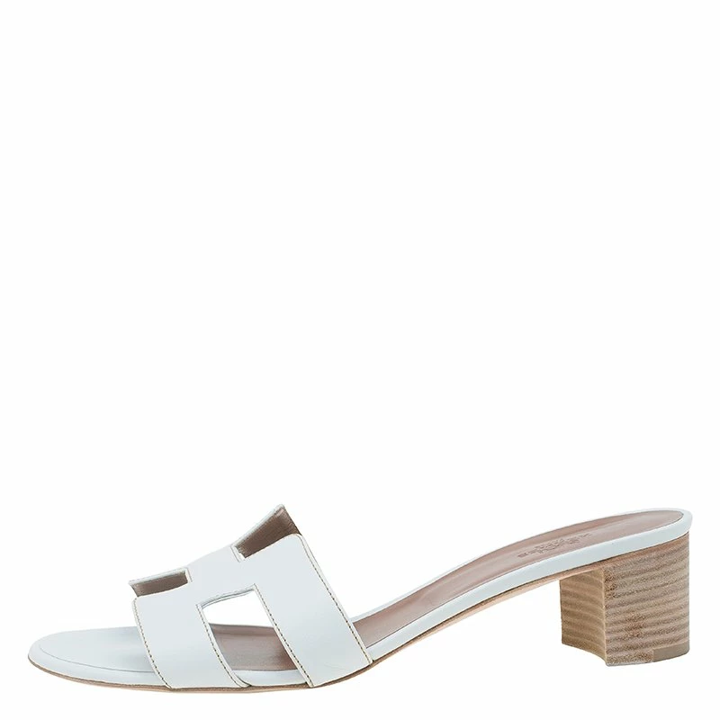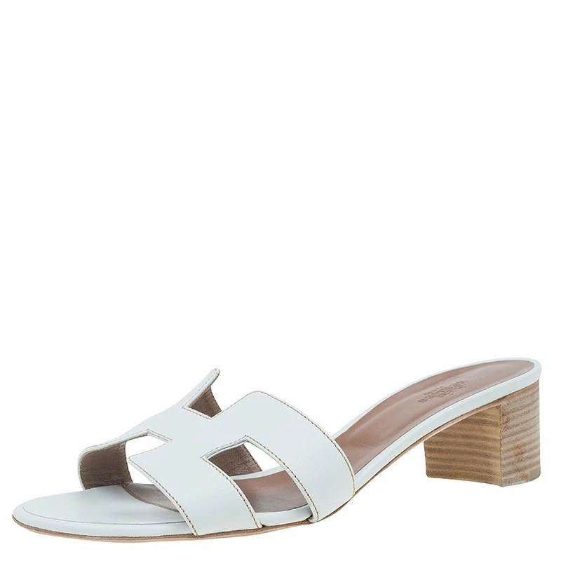 Crafted in white leather, these Oasis slides from Hermes are classy and comfortable with their wood finished 4.5 cm heels. These slides feature the signature H-shaped straps with contrasting brown seams. The insoles are lined with leather and Hermes labels.