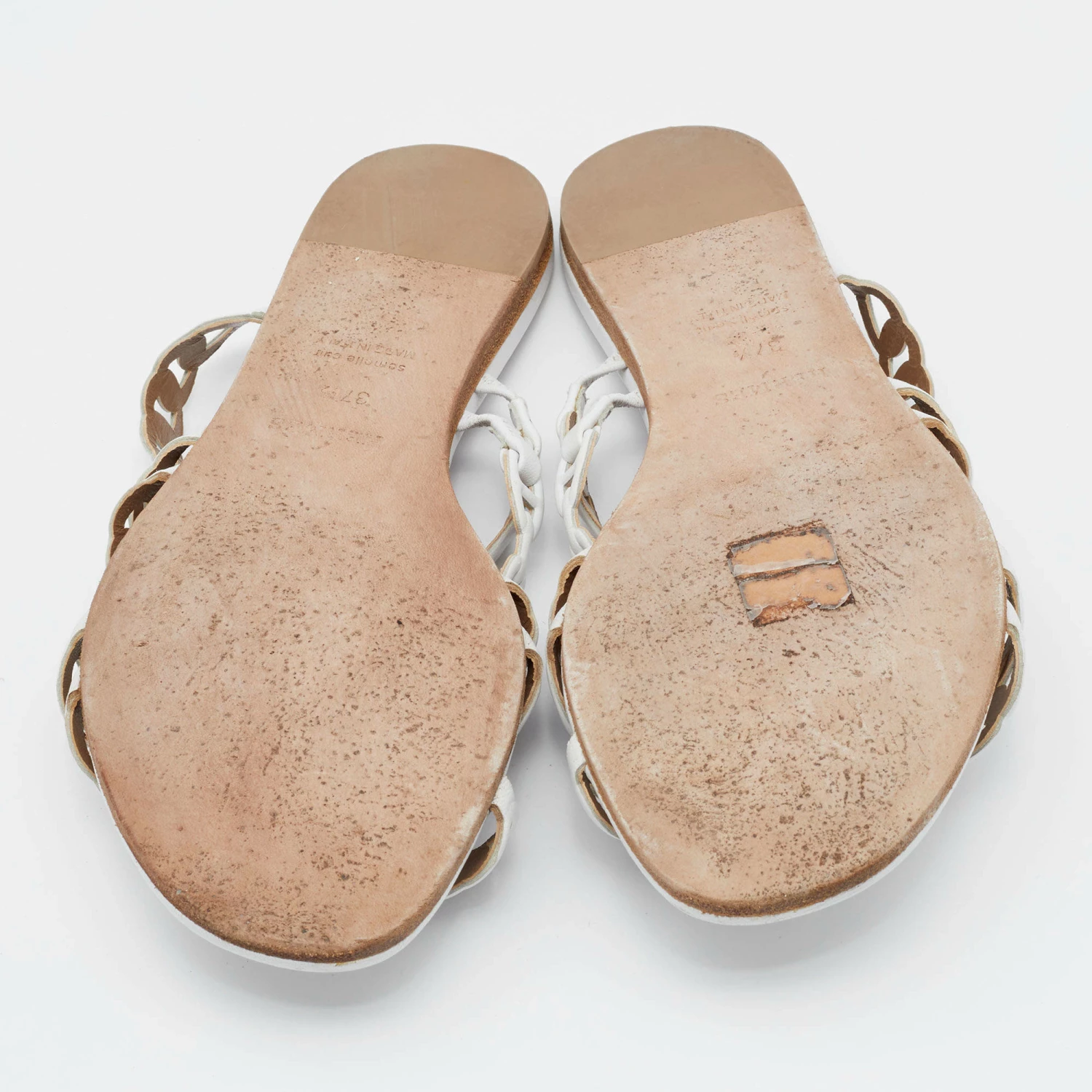 These slide sandals from Hermes are simply amazing! They have been crafted from leather in a lovely white shade and designed in an open-toe silhouette with three chain-link straps across the vamps. They are endowed with comfortable insoles and durable outsoles.