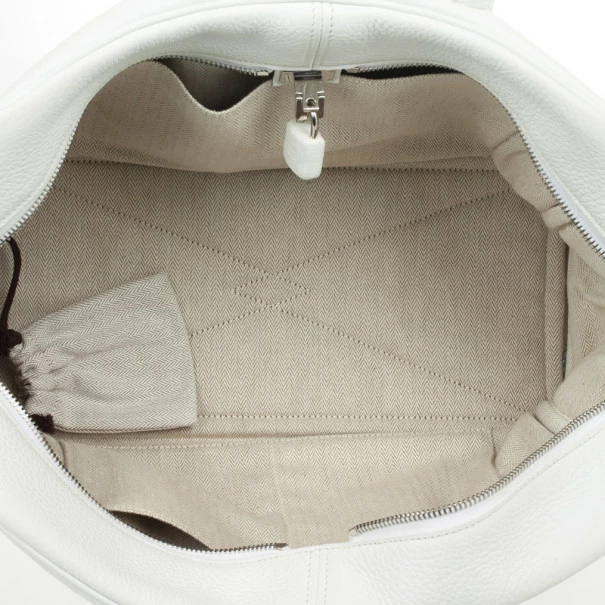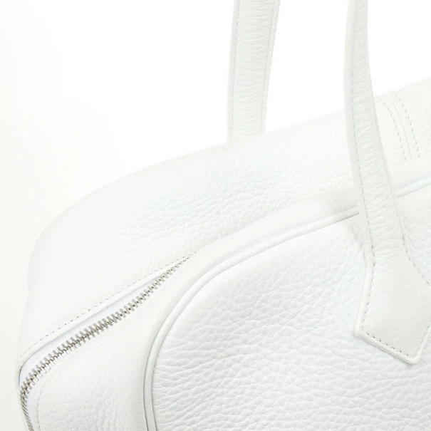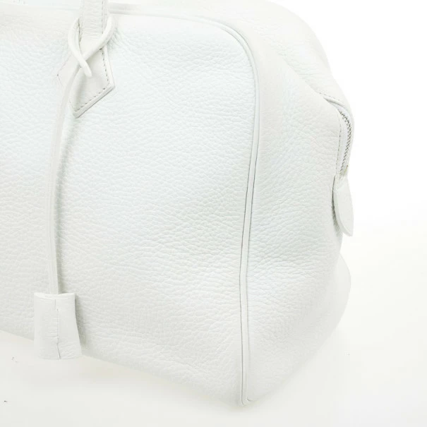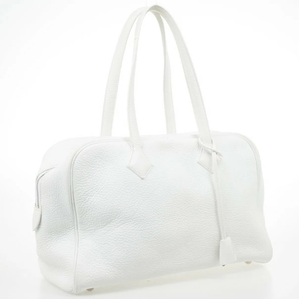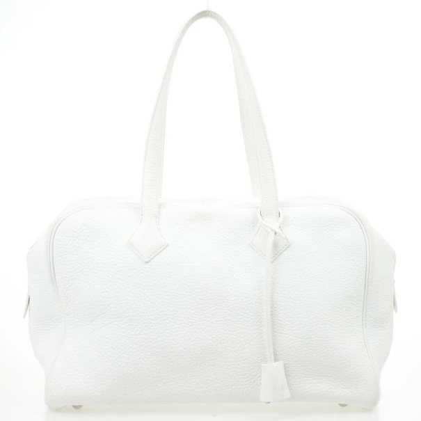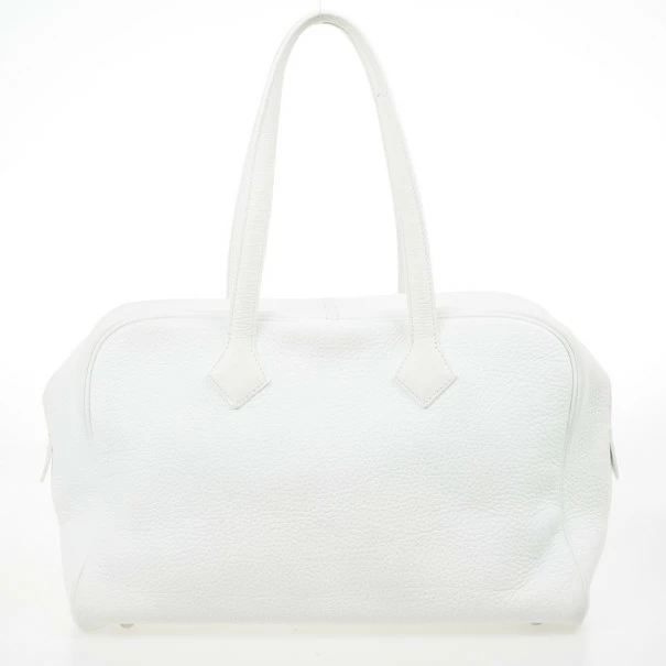This Hermes White Leather Victoria Elan Bag is crafted from flawless white leather and is accented with palladium hardware. It comes with double flat leather handles, keys and a padlock. The double top zip closure opens up to a canvas lined interior. Final sale, no return.Original Retail Price:US $4,050