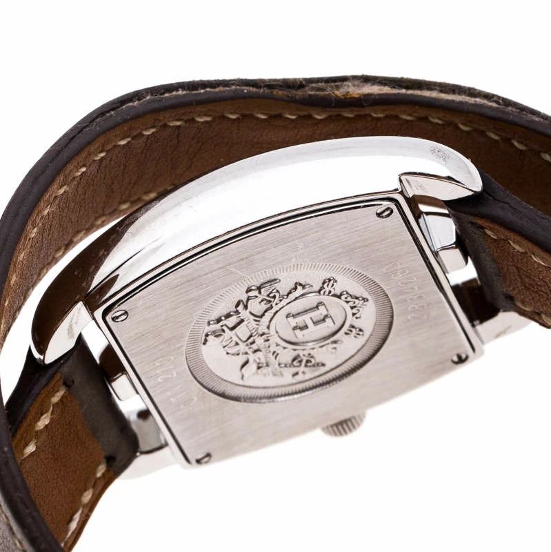 This Cape Cod watch from Hermes stands for quality and sophistication. The watch features a stainless steel case held by a brown-colored leather strap that can be double wrapped around your wrist and secured with a buckle. Powered by a quartz movement, this elegant timepiece has a tonneau-shaped bezel that houses a white dial, equipped with Arabic numeral hour markers and two hands. This watch is a subtle way of giving yourself a polished look.