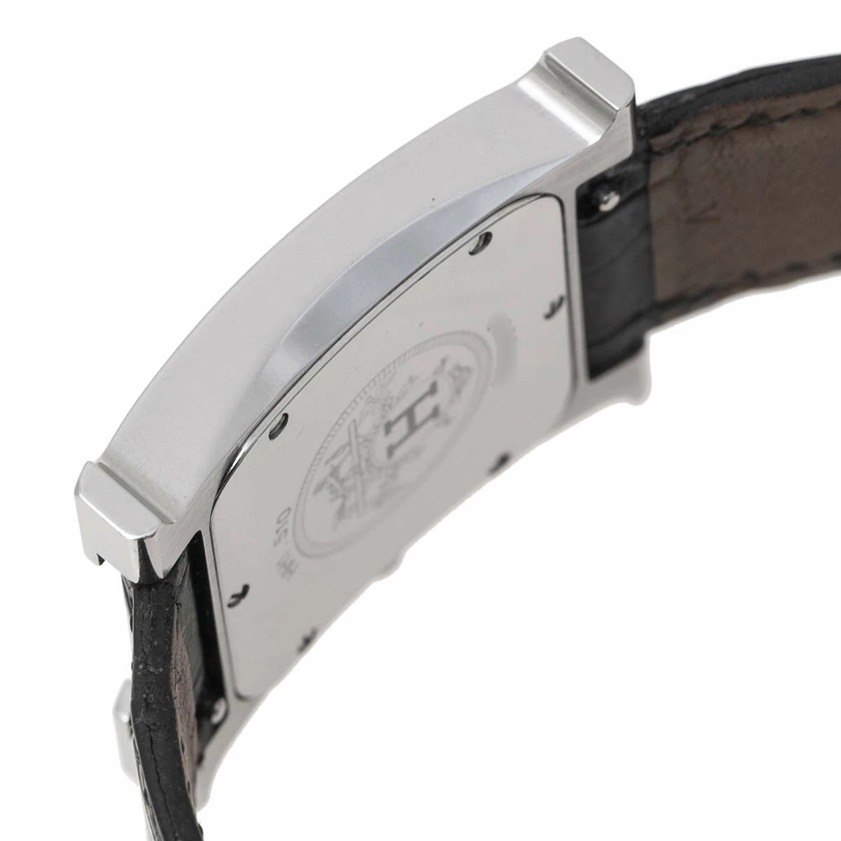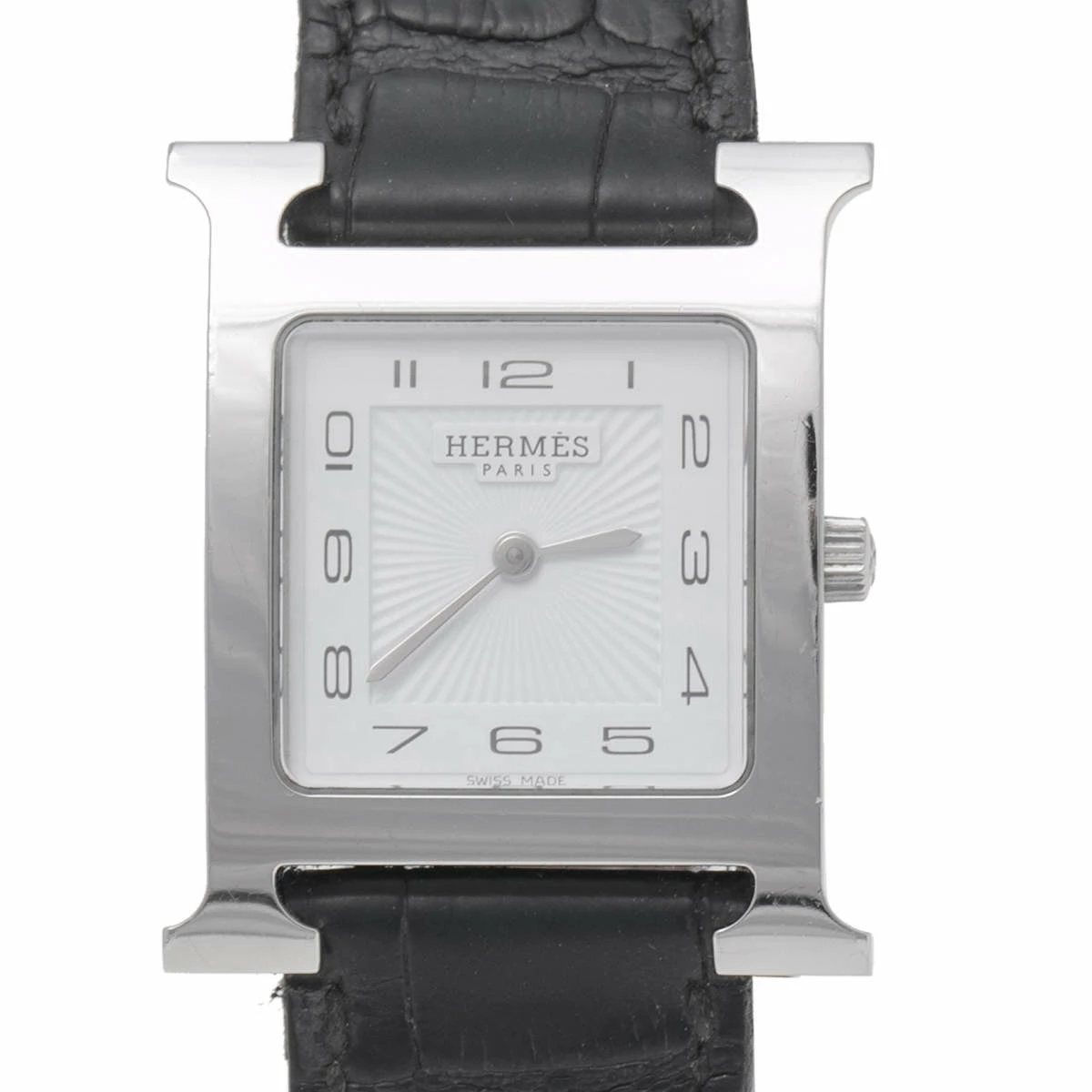 This Heure H watch from Hermes stands for quality and sophistication. The watch features a signature ‘H’ case in stainless steel and held by alligator leather straps with buckle fastenings. Powered by quartz movement, this elegant timepiece has a white dial equipped with Arabic numeral hour markers and stick hands. Complete with 30 meters of water resistance, this watch is a subtle way of giving yourself a polished look.