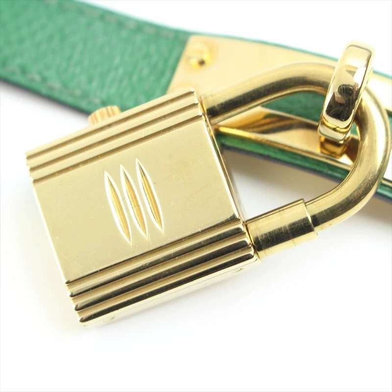 Hermes Kelly watches are one of their iconic designs which can be easily recognized with its signature lock case. The green grained leather strap features a buckle strap closure and yellow gold hardware. The lock case on this watch includes a white dial, with the classic H logo at the 12 hour mark with gold hour and minute hands.