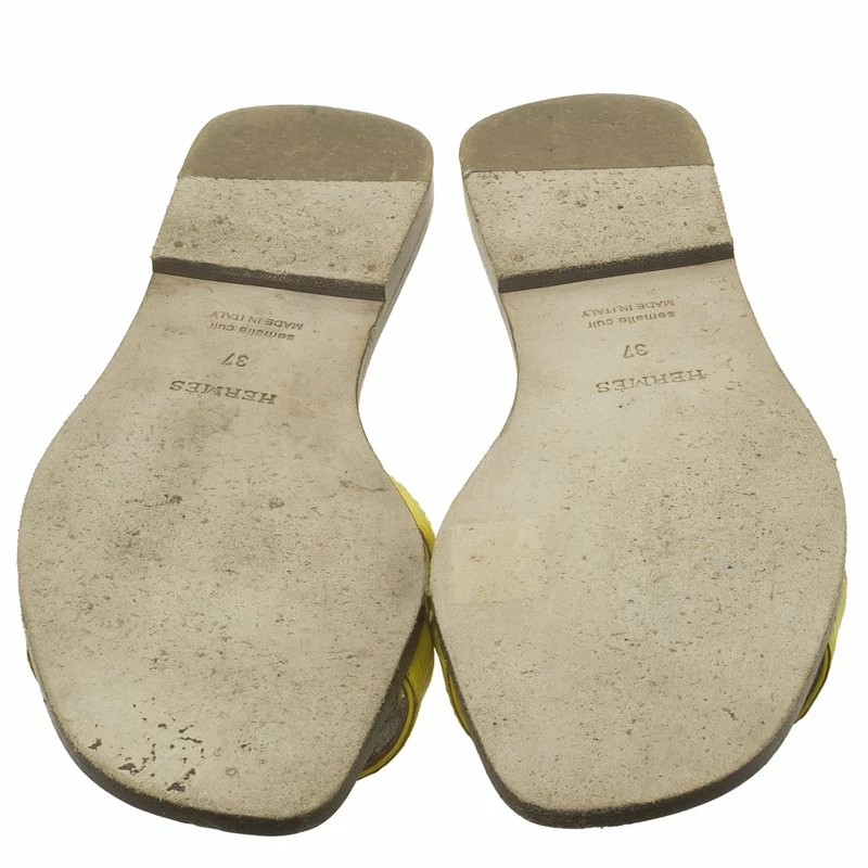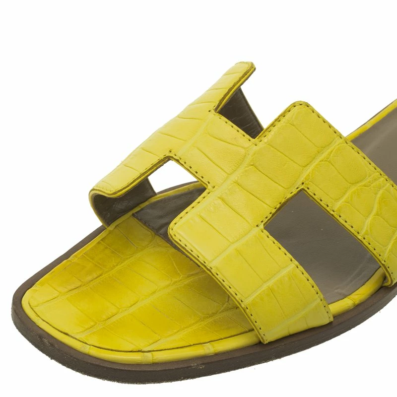 This simple yet classy and stylish pair of croc embossed oran box sandals from Hermes will add a spark to your look. It is crafted from leather, featuring H designed straps on the vamp. They come with leather insoles and carry brand labeling.