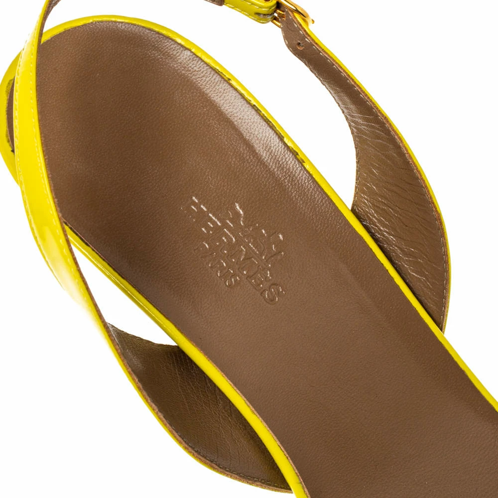 Stay comfortable from day to night and look your stylish best in these yellow sandals from Hermes. They are crafted from patent leather and styled with ‘H’ vamp straps and buckle slingbacks. Comfortable leather lined insoles and 9 cm heels complete this lovely pair.