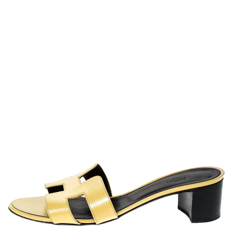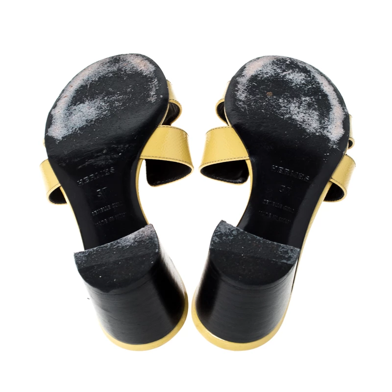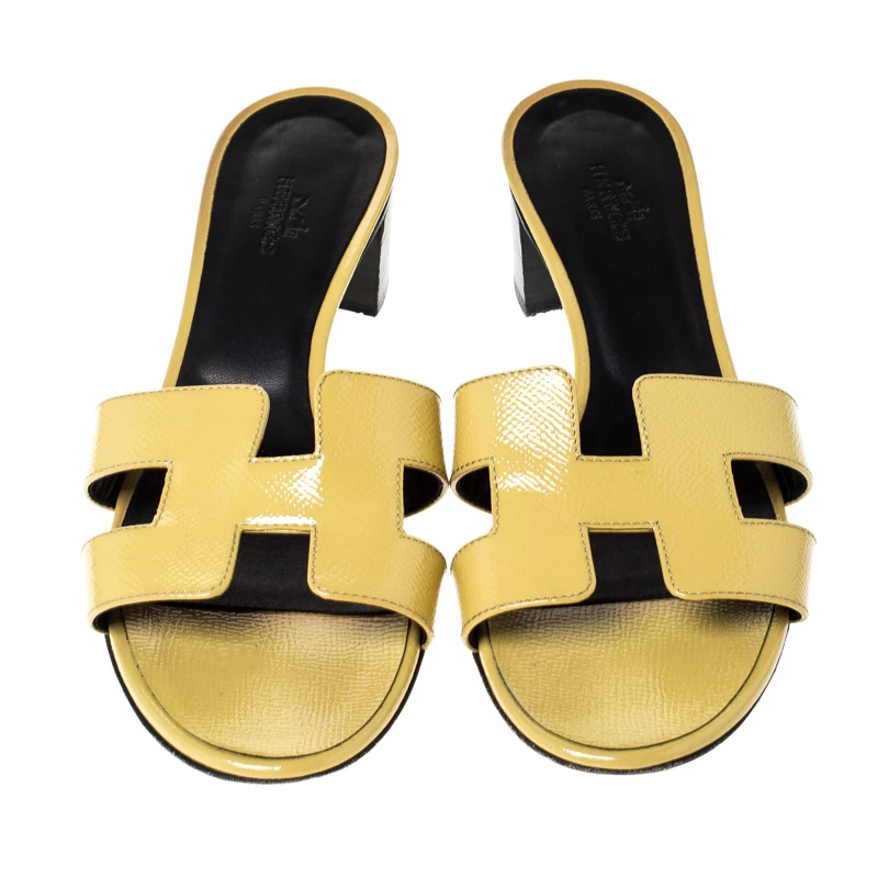 These yellow slide sandals from Hermes are a pair of simple and casual shoes. These slides have the signature H-shaped design in patent leather across the vamps, open toes and block heels. The insoles are lined with leather and feature the brand label.