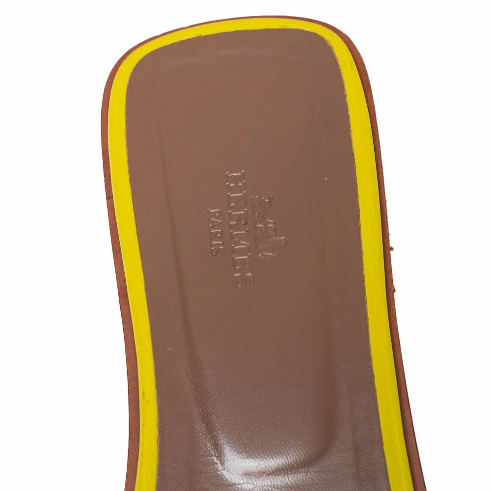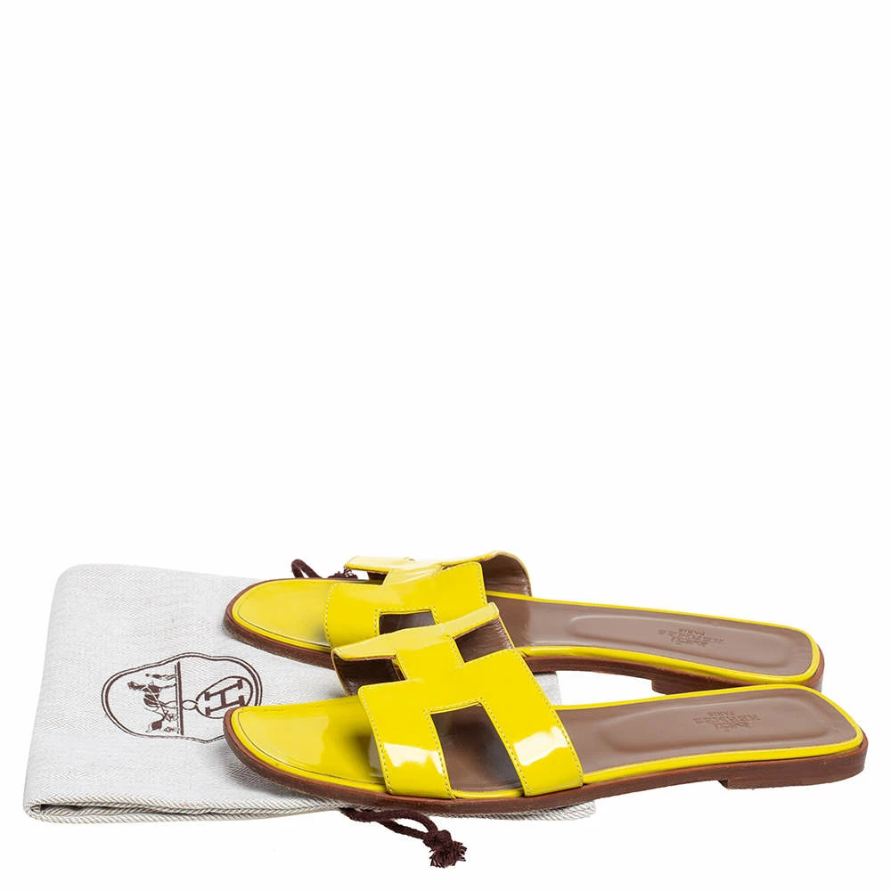 Put your best foot forward this season in these pretty Hermes sandals. These yellow Oran sandals have been crafted from patent leather in Italy and they feature the iconic H on the vamps as well as insoles meant to provide comfort at every step. These sandals are sure to attract admirers!