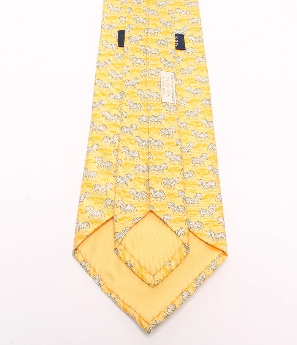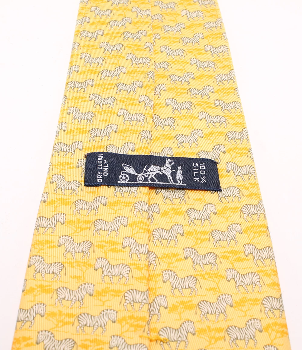 Flaunt an effortless style with this stunning Hermes tie. Crafted in fine silk, this tie is accented with a zebra pattern on it that lends it a quirky feel. It features a wide silhouette and comes in a brilliant yellow hue that makes it a versatile item in your collection.